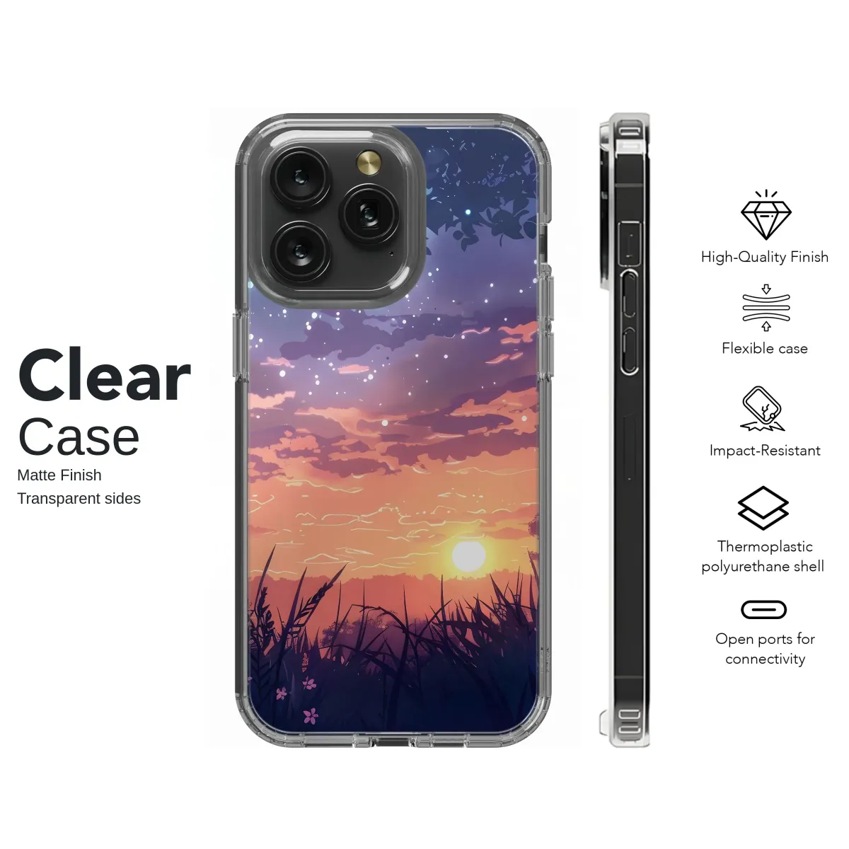 Immerse yourself in the tranquil beauty of this captivating anime landscape illustration. Featuring a breathtaking transition from the warm glow of a setting sun to the enchanting deep blues of an approaching night sky, this design is a feast for the eyes, blending realistic natural elements with a distinct artistic flair that resonates with lovers of Japanese animation aesthetics. The horizon is painted with stunning shades of fiery orange, soft pink, and mystical purple, highlighted by soft, dreamy clouds that drift peacefully across the vibrant backdrop, creating a picturesque view. As twilight descends and the last rays of the sun dip below the horizon, delicate star-like specks begin to twinkle and shimmer across the upper portion of the scene, creating a magical, almost celestial atmosphere that feels truly out of this world, adding a touch of fantasy and wonder to the natural landscape. In the foreground, beautifully rendered silhouettes of blades of grass and subtle floral details add depth and a touch of grounded nature to the ethereal scene, inviting the viewer into this serene meadow setting. This artwork masterfully captures the peaceful, transient moment between the vibrant end of day and the magical arrival of night, evoking a sense of wonder, calm, and nostalgic fantasy. The unique color palette and stylized, illustrative details make it a truly striking visual piece that stands out. Perfect for anyone who appreciates nature's unparalleled beauty fused with a distinctive artistic and illustrative touch, this design brings a little piece of this magical twilight scenery into your daily life. It's a statement piece showcasing a unique, aesthetic sunset and a mesmerizing starry night view, creating a serene and beautiful visual experience. This vibrant landscape art is an exceptional way to carry a piece of serene, fantasy-inspired nature art with you.