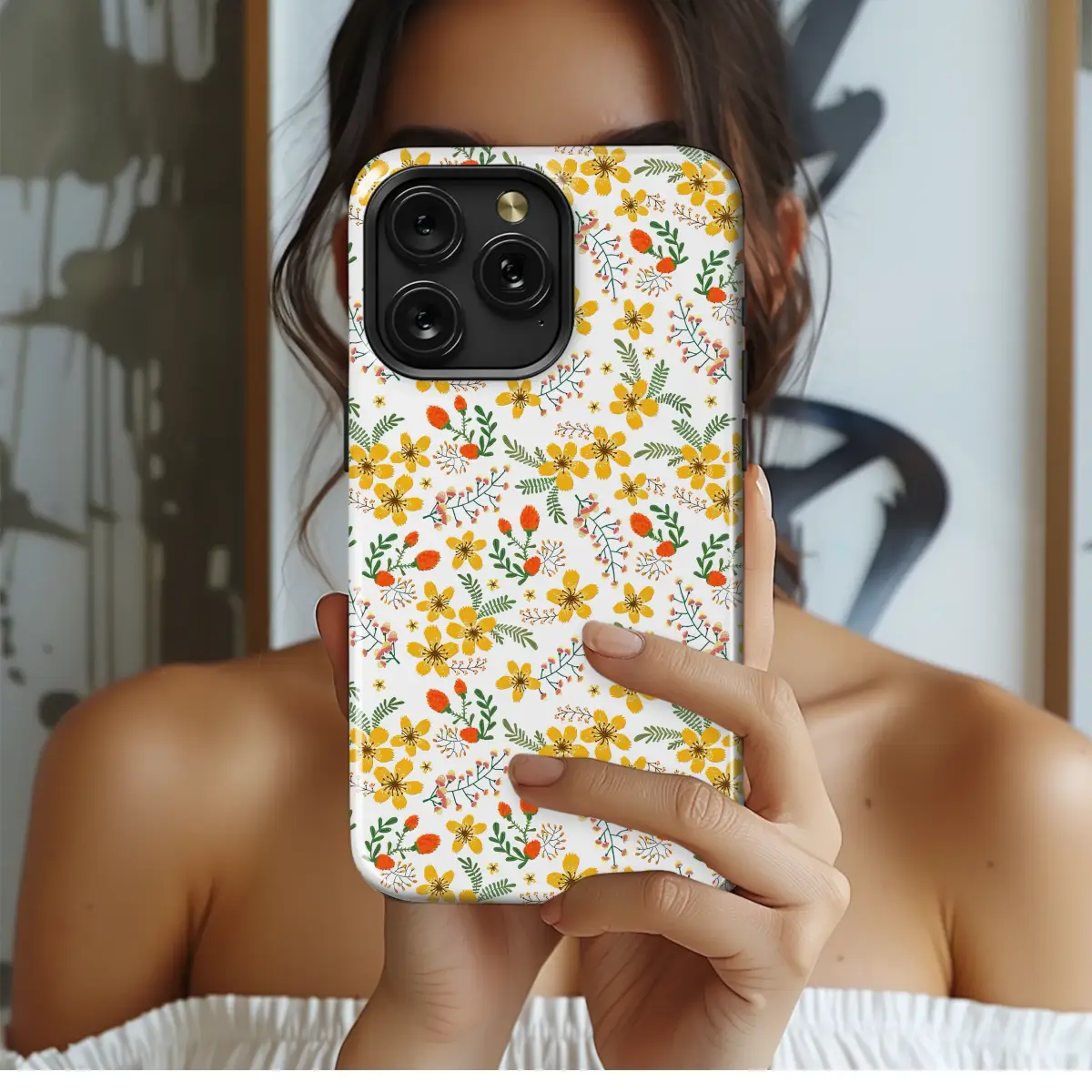 Step into a perpetually sunlit field with our enchanting wildflower design, a vibrant celebration of nature's simple yet profound beauty. This delightful pattern captures the carefree spirit of a summer meadow, where cheerful yellow blossoms scatter like captured sunshine, radiating pure joy and unbridled optimism. Each flower, rendered with a charming, folk-art inspired texture, seems to dance across the crisp white backdrop, creating a sense of fresh, airy delight that instantly lifts the spirits. Interspersed among the golden blooms are bright pops of warm orange buds and delicate sprays of verdant green foliage, adding intricate depth and a touch of rustic whimsy to the botanical tapestry. This isn't just a design; it's an emotion—a pocketful of sunshine to brighten your daily routine and add a splash of cottagecore elegance to your most-used accessories. It's the perfect way to carry the warmth of a blooming garden with you, a constant reminder of sunny days and natural wonder. For the nature lover, the bohemian spirit, or as a thoughtful gift for a friend, this lively floral artwork will infuse any item with radiant energy and timeless charm.