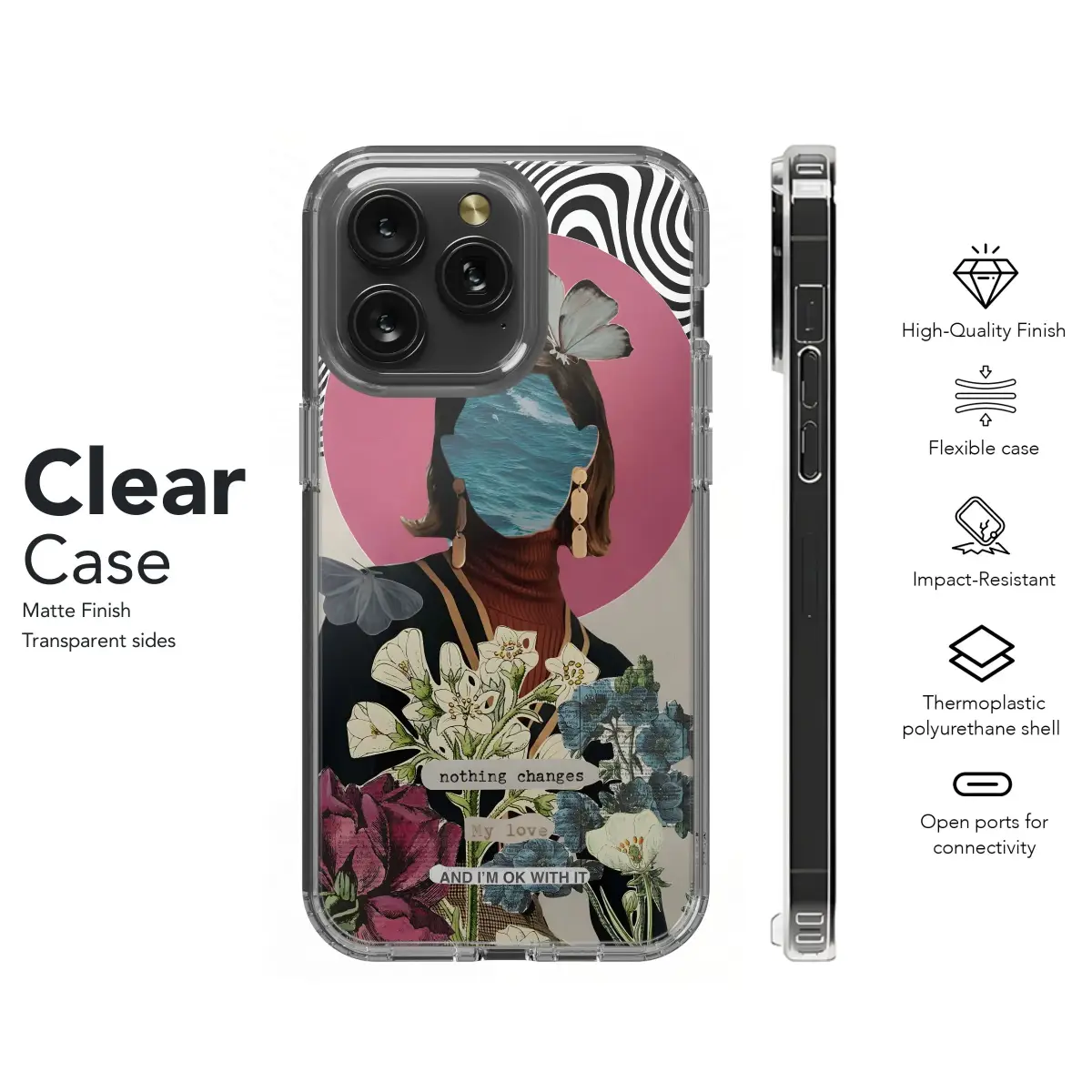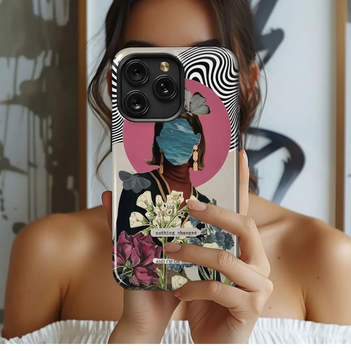Elevate your everyday with this captivating and surreal art print, a unique statement piece perfect for the modern individualist. This striking design features a collage of contrasting textures and elements, blending vintage aesthetics with a contemporary twist. A woman's silhouette is reimagined with ocean waves for a face, adorned with delicate butterflies and elegant floral arrangements, creating a dreamy and ethereal feel. The monochrome psychedelic background adds an element of intrigue, while the subtle affirmation "nothing changes. My love, and I'm ok with it" provides a touch of introspective charm. Ideal for those who appreciate art, vintage inspired designs, and surrealism, this eye-catching design offers a stylish way to personalize your device and express your unique personality. Let this art become a conversation starter and a reflection of your distinctive taste, a stylish accessory to make a bold statement.