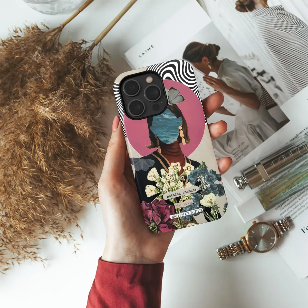 Elevate your everyday with this captivating and surreal art print, a unique statement piece perfect for the modern individualist. This striking design features a collage of contrasting textures and elements, blending vintage aesthetics with a contemporary twist. A woman's silhouette is reimagined with ocean waves for a face, adorned with delicate butterflies and elegant floral arrangements, creating a dreamy and ethereal feel. The monochrome psychedelic background adds an element of intrigue, while the subtle affirmation "nothing changes. My love, and I'm ok with it" provides a touch of introspective charm. Ideal for those who appreciate art, vintage inspired designs, and surrealism, this eye-catching design offers a stylish way to personalize your device and express your unique personality. Let this art become a conversation starter and a reflection of your distinctive taste, a stylish accessory to make a bold statement.