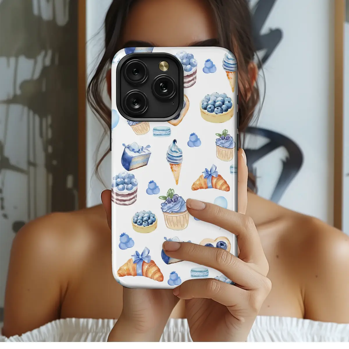 Indulge your senses in a whimsical world of sweet delights with this enchanting watercolor design. It’s a celebration of all things sweet, capturing the delightful essence of a sun-drenched French patisserie. Each tiny illustration is a masterpiece, from the flaky, golden croissants tied with delicate blue ribbons to the decadent layer cakes piled high with fresh, juicy blueberries. Discover heart-shaped cookies topped with berries, fluffy cupcakes with swirls of creamy frosting, and delightful blueberry tarts that look almost good enough to eat. Swirls of soft-serve ice cream in a crisp cone, light-as-air macarons, and festive balloons float playfully, creating a pattern that’s both elegant and utterly charming. The beautiful blend of cobalt and sky blues against warm pastry tones evokes a feeling of pure happiness and sweet nostalgia. This design is a perfect treat for the foodie, the baker, or anyone who appreciates the cozy, coquette aesthetic. Let this beautiful artwork wrap your everyday essentials in a story of sweetness, artistry, and the simple, joyful pleasures of life.