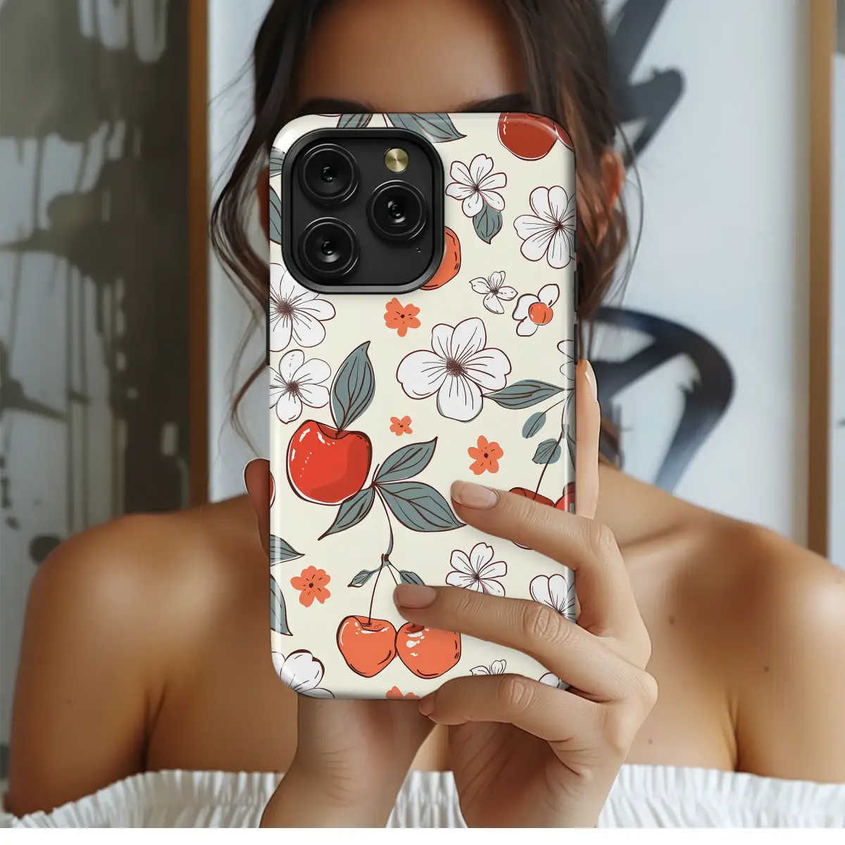 Step into a sun-drenched memory with this delightful retro-inspired design, where sweet cherries and whimsical blossoms dance across a creamy canvas. This charming artwork captures the carefree spirit of a vintage summer, blending juicy, pop-art style cherries in warm shades of red and coral with delicate, hand-drawn white flowers that exude a 70s vibe. The muted teal-green leaves add a perfect touch of cool contrast, creating a balanced and aesthetically pleasing botanical pattern perfect for anyone who loves the cottagecore aesthetic. Each element feels lovingly illustrated, evoking a sense of nostalgic comfort and playful innocence. This groovy fruit pattern is the perfect way to infuse your daily essentials with a dose of unique personality, turning a simple accessory into a statement of sweet, artistic style. Let this enchanting fruit and floral illustration bring a smile to your face and a touch of whimsical art to your fingertips. It’s a timeless piece for your most-used tech, a beautiful gift for lovers of unique, vintage-inspired designs and the simple joys of a summer orchard.