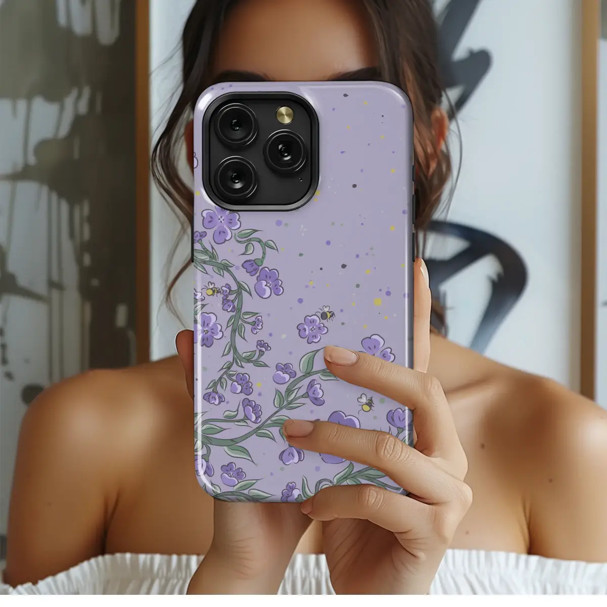 Wander into a secret garden where the air is sweet and the gentle hum of happy bees fills the breeze. This enchanting design captures a moment of pure spring magic, featuring delicate lilac-hued wildflowers climbing gracefully on twisting green vines. Set against a dreamy lavender canvas, the scene comes alive with tiny, cheerful honeybees, their heart-shaped wings fluttering as they dance from petal to petal. The entire illustration is dusted with a confetti of playful speckles in shades of buttercup yellow, soft moss green, and deep violet, adding a touch of whimsical texture and joyful movement. This is a celebration of nature's simple, perfect moments—a little piece of a sun-drenched meadow you can carry with you. Ideal for the romantic soul, the nature lover, and anyone who adores the cozy cottagecore aesthetic, this beautiful botanical art brings a sense of calm and wonder to your daily essentials. Let this unique, hand-drawn illustration transform your favorite accessory into a statement of your love for the whimsical and the wild. It’s more than just a pretty pattern; it’s an invitation to find magic in the little things, a tiny, portable escape to a peaceful, blooming paradise. A thoughtful and charming gift for a friend or kindred spirit who appreciates unique, artist-designed pieces that tell a story.