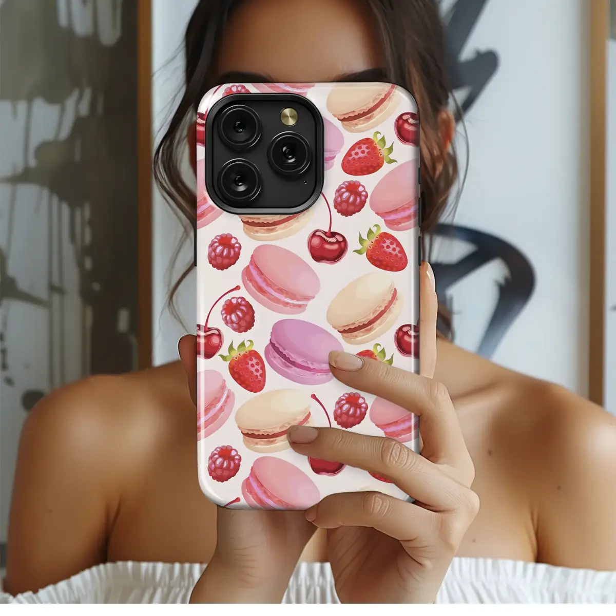 Step into a whimsical Parisian patisserie with every glance at this utterly delightful design. Imagine the sweet aroma of a charming French bakery as a beautiful cascade of delicate macarons, in dreamy shades of blush pink, soft lavender, and creamy vanilla, tumbles across a soft, elegant background. Nestled between these delectable treats are plump, sun-ripened strawberries, glistening ruby-red cherries with their elegant stems, and perfectly textured raspberries, creating a vibrant and seamless tapestry of confectionary joy. Each illustrated element is rendered in luscious, painterly detail, capturing the crisp shell of the macaron and the juicy burst of the fresh berries. This enchanting pattern is a perfect expression for anyone who adores the romantic coquette aesthetic, the cozy charm of cottagecore, or simply has an incurable sweet tooth. It’s a beautiful way to wrap your most-used accessory in a layer of playful sophistication and feminine grace. Let this foodie-inspired artwork bring a daily dose of sweetness to your routine, transforming your essential tech into a delicious statement of your unique personal style. This elegant dessert pattern is more than just a design; it’s a mood, a reminder of life’s simple pleasures, making it the perfect gift for the dessert lover in your life or a charming treat for yourself.