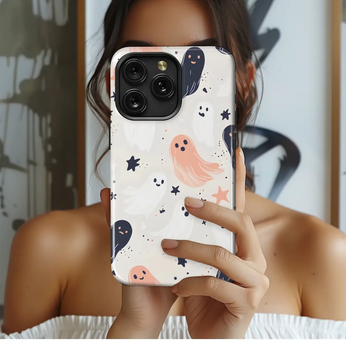 Embrace the magic of the cozy season and let a friendly haunting follow you wherever you go with this enchanting design. Imagine a whimsical dance of the sweetest spirits floating through a starry twilight sky, captured just for you. These aren't your average spooks; they're cheerful specters in soft blush peach, deep charcoal night, and creamy off-white, each with a unique and adorable expression that's more charming than chilling. They drift peacefully amidst a celestial swirl of twinkling stars and magical stardust, creating a dreamy, cottagecore spooky scene that feels both playful and chic. This is the perfect autumn aesthetic to dress up your most essential daily companion, wrapping your portal to the world in a protective layer of pure enchantment. It’s a pocket-sized piece of art for lovers of all things witchy, whimsical, and wonderful, adding a touch of boho Halloween style to your everyday. Whether you're a fan of pastel goth vibes or just want a unique accessory that sparks joy, let this starry night gathering of ghoulishly cute friends guard your connection to the world, making every glance a little more magical. It's the perfect fall gift for your spooky-loving bestie or a delightful treat for yourself
