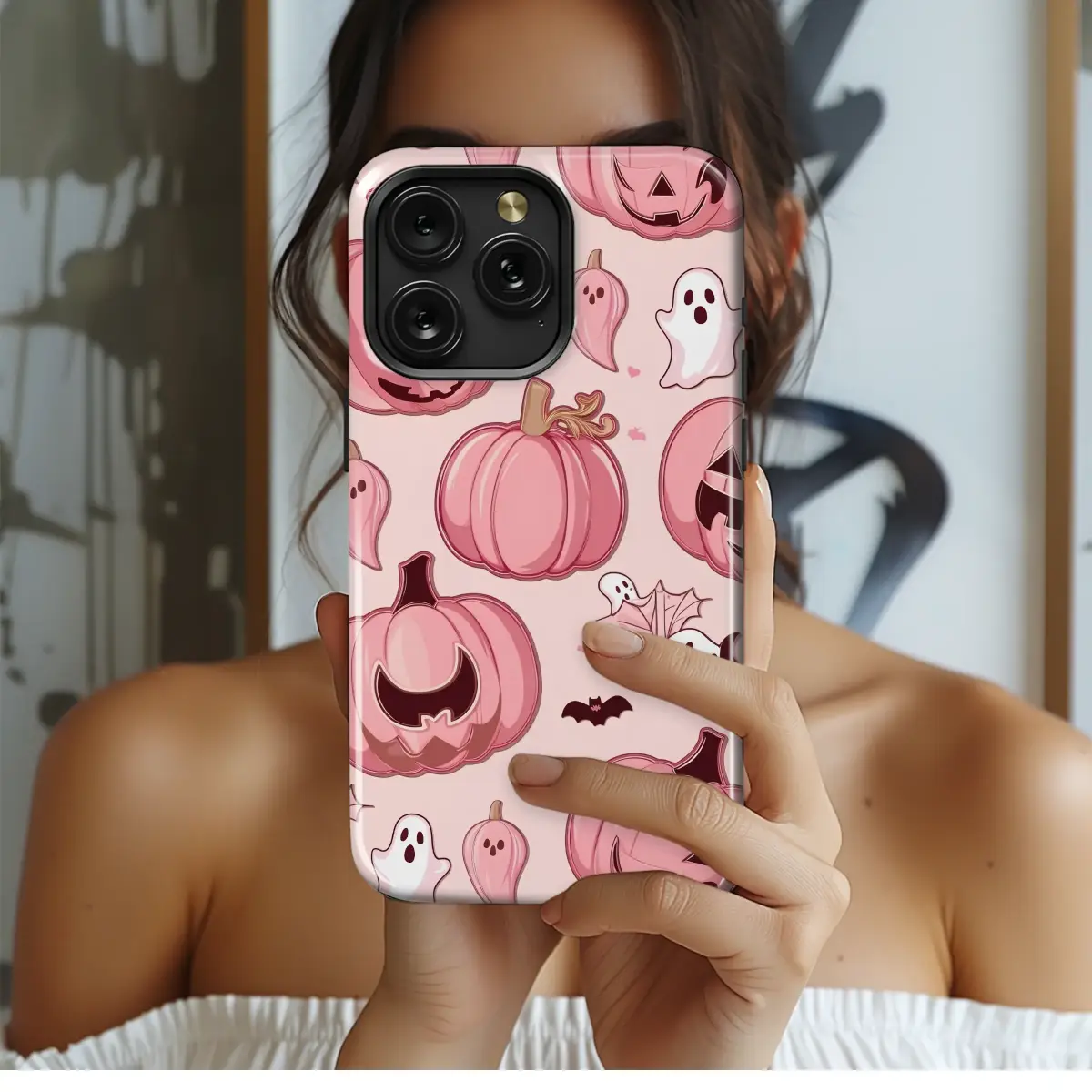 Embrace the spooky season with a delightful twist of sweetness! Step into a whimsical world where Halloween dreams are painted in enchanting shades of blush and rose. This captivating pattern brings a playful spirit to the classic autumn aesthetic, creating a unique pastel goth vibe perfect for those who dance between light and shadow. Darling pink jack-o'-lanterns grin mischievously, their carved smiles glowing with a soft, inviting energy. They are joined by the most adorable little ghosts, whose friendly 'boos' are whispered on the breeze, scattered amongst tiny hearts and flitting bats. This isn't your average spooky design; it's a full celebration of all things creepy cute and kawaii, a true cottagegore fantasy. Every intricate detail, from the ornate, curling pumpkin stems to the tiny ghost-bats, is lovingly crafted to spark joy and bring a touch of everyday magic to your personal style. Let this girly Halloween art be your perfect companion for haunted hayrides and pumpkin spice lattes, adding a pop of personality that is both sweet and haunting to your most essential accessory.