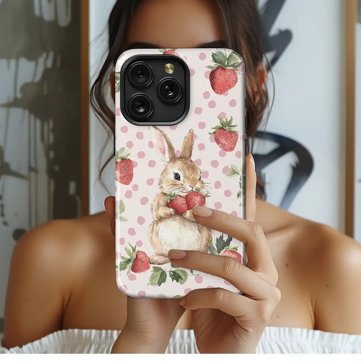 Step into a whimsical world where sweet moments are captured in soft, dreamy watercolors. This enchanting design features an adorable, fluffy bunny nestled amongst luscious, ripe strawberries, its big, curious eyes sparkling with delight. Each brushstroke brings this gentle creature to life, from its twitching whiskers to the delicate texture of its fur as it happily clutches its fruity treasures. The background, a playful pattern of pink polka dots, adds a touch of sweet nostalgia and storybook charm. This artwork is a celebration of simple joys and the gentle beauty of nature, perfect for anyone who loves the cottagecore aesthetic and woodland wonders. Let this delightful illustration wrap your favorite accessory in a cozy, heartwarming embrace, carrying a sprinkle of countryside magic and cheerful innocence with you wherever you go. It’s more than just a design; it’s a tiny escape to a sunny, strawberry-scented afternoon.