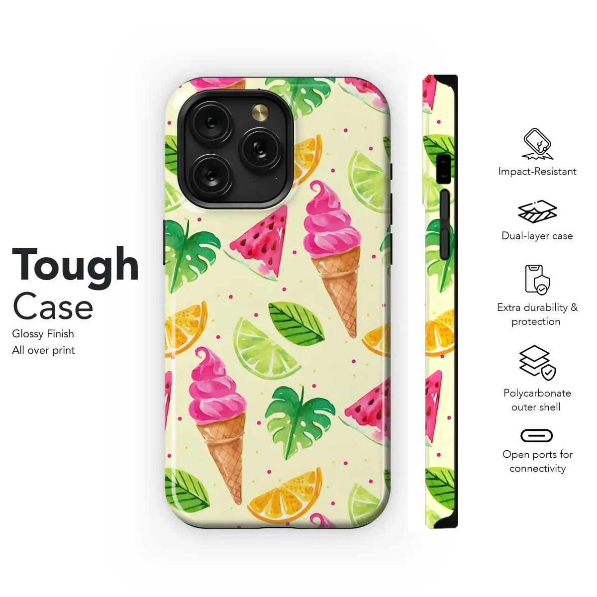 Capture the essence of summer sweetness and tropical fun with this vibrant artistic pattern. Featuring a delightful array of elements, this design combines the cool indulgence of pink swirled ice cream cones, depicted in delightful detail with their crisp waffle cones, alongside the juicy refreshment of bright red watermelon slices bursting with seeds. Zesty citrus segments, including vibrant orange and tangy lime, add a burst of refreshing color and flavor to the mix. Lush green monstera leaves are artfully interspersed throughout the arrangement, adding a touch of tropical jungle flair and providing a lovely contrast to the fruity and sweet tones. Set against a soft, sunny yellow backdrop scattered with playful pink dots, the overall look is irresistibly cheerful and brimming with warm weather vibes. This lively print evokes feelings of sunny days by the pool or beach, indulging in sweet treats, and dreaming of exotic getaways, making it a perfect aesthetic choice for adding a pop of color and personality to your favorite tech gear, journals, or other everyday items. Imagine carrying a piece of paradise with you, adorned with this cute and refreshing mix of summer's best flavors and foliage. The hand-painted watercolor style lends a touch of unique charm and artistry, bringing these sweet fruits, frozen desserts, and tropical leaves to life with soft textures, beautiful gradients, and vibrant hues. Perfect for anyone who loves bright colors, playful aesthetics, and the joy of a summer holiday, this pattern is a truly sweet escape, promising a burst of happiness every time you see it. Its cheerful composition and eye-catching elements are sure to brighten any day.