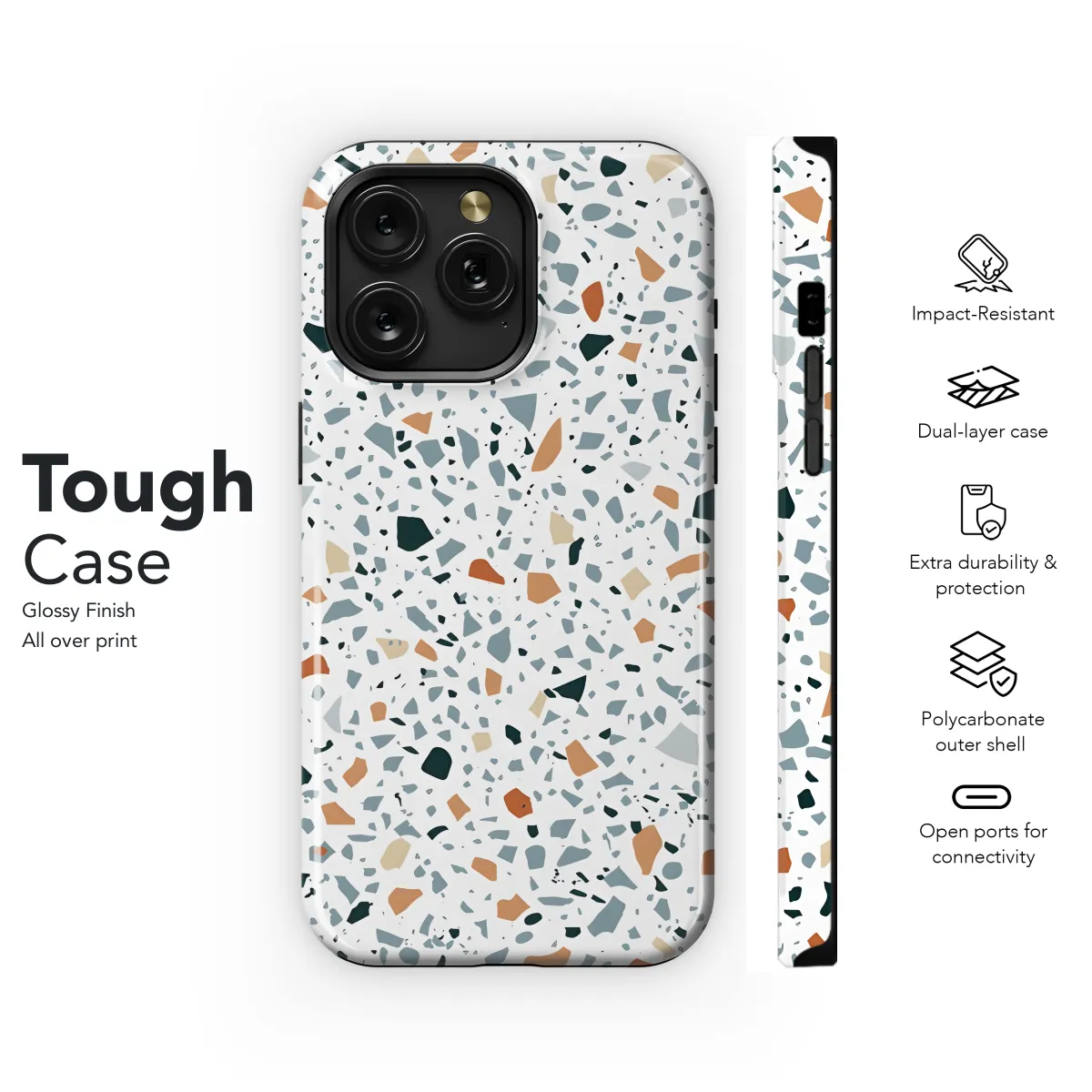 Protect your phone in style with this eye-catching Terrazzo Phone Case. Its durable construction shields your device from everyday wear and tear, while its unique terrazzo design adds a touch of sophistication to your look. Compatible with iPhone, Samsung, and Pixel models, this case offers a perfect fit and easy access to all buttons and ports.