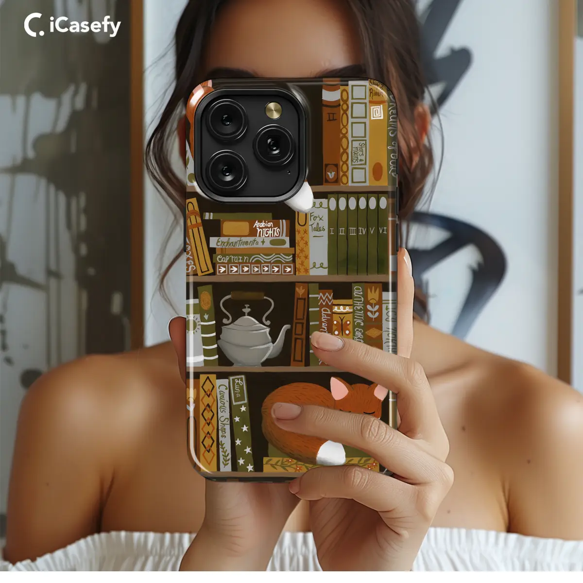 Snuggle up with a good book and your favorite furry friends with our enchanting "Cozy Bookshelf with Foxes" phone case. Embark on a whimsical journey through a literary world filled with cunning foxes peeking out from behind enchanting bookshelves. Its charming design will add a touch of bibliophile flair to your device while protecting it from the perils of daily life.