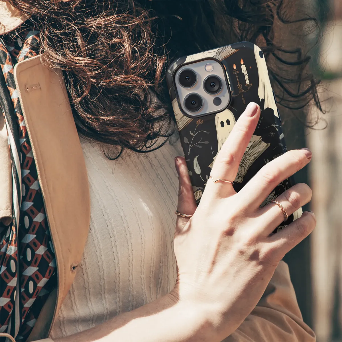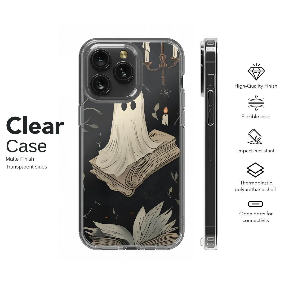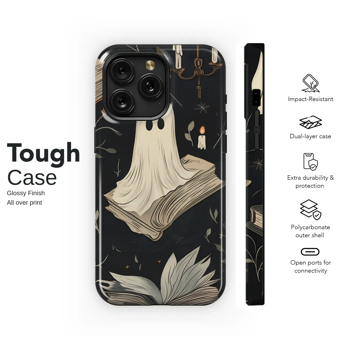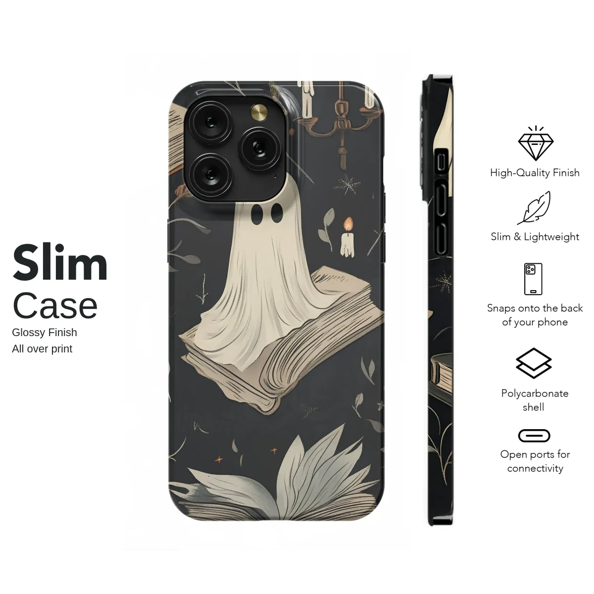Step into a world where friendly spirits drift through a haunted library, their silent companionship a comfort on a cool autumn night. This enchanting design captures the cozy magic of a late-night reading session, illuminated only by the soft, flickering glow of candlelight. Little ghosts float gently over leather-bound tomes and between delicate, twisting vines, their simple forms adding a touch of whimsical goth charm to the moody, dark academia aesthetic. Each detail, from the melting wax on the candelabra to the scattered starlight on the deep charcoal background, invites you into a story waiting to be discovered. Perfect for the dedicated bookworm, the lover of vintage illustration, or anyone who believes spooky season is a year-round state of mind, this artwork is a love letter to dusty bookshelves and whispered ghost stories. Carry a piece of this spectral sanctuary with you, and let its unique charm transform your everyday essentials into a portal to a world of literary fantasy and cozy, gothic wonder. It makes an ideal and thoughtful gift for the reader in your life who adores all things magical and mysterious.