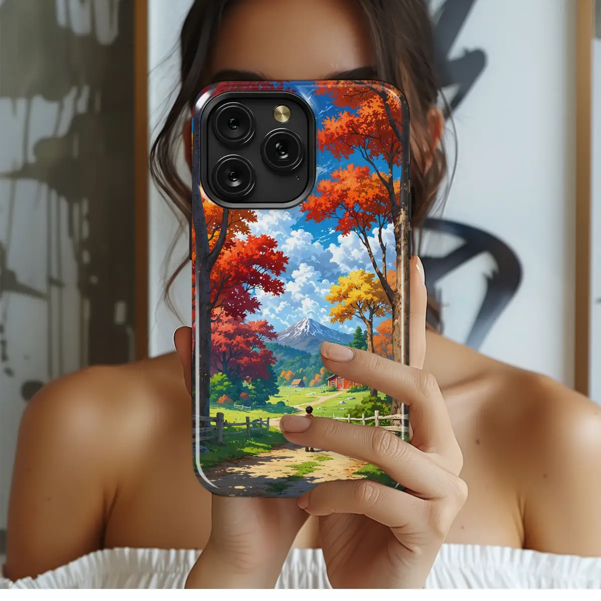 Step into a world brimming with nostalgic adventure and the cozy magic of autumn. Let this stunning, Ghibli-inspired landscape carry you away on a winding country road, where the air is crisp and the world is painted in the fiery reds and golden yellows of fall foliage. Gaze up at a brilliant blue sky filled with fluffy, dream-like clouds, a perfect backdrop for the majestic, snow-capped mountain that watches over a peaceful valley. In this scene, a lone adventurer begins their journey, walking toward a welcoming red barn that promises warmth and comfort, a perfect slice of the cottagecore aesthetic. This isn't just an image; it's a feeling—a pocket of peaceful wanderlust and Japanese anime-style artistry you can hold in your hand. Let this vibrant, whimsical design transform your most essential daily companion into a piece of expressive art, a constant reminder of the beauty in both the journey and the destination. It’s the perfect artistic accessory for anyone who dreams of mountain scenery, a unique gift for the anime lover in your life who cherishes that cozy, adventurous vibe and wants their tech to tell a story.