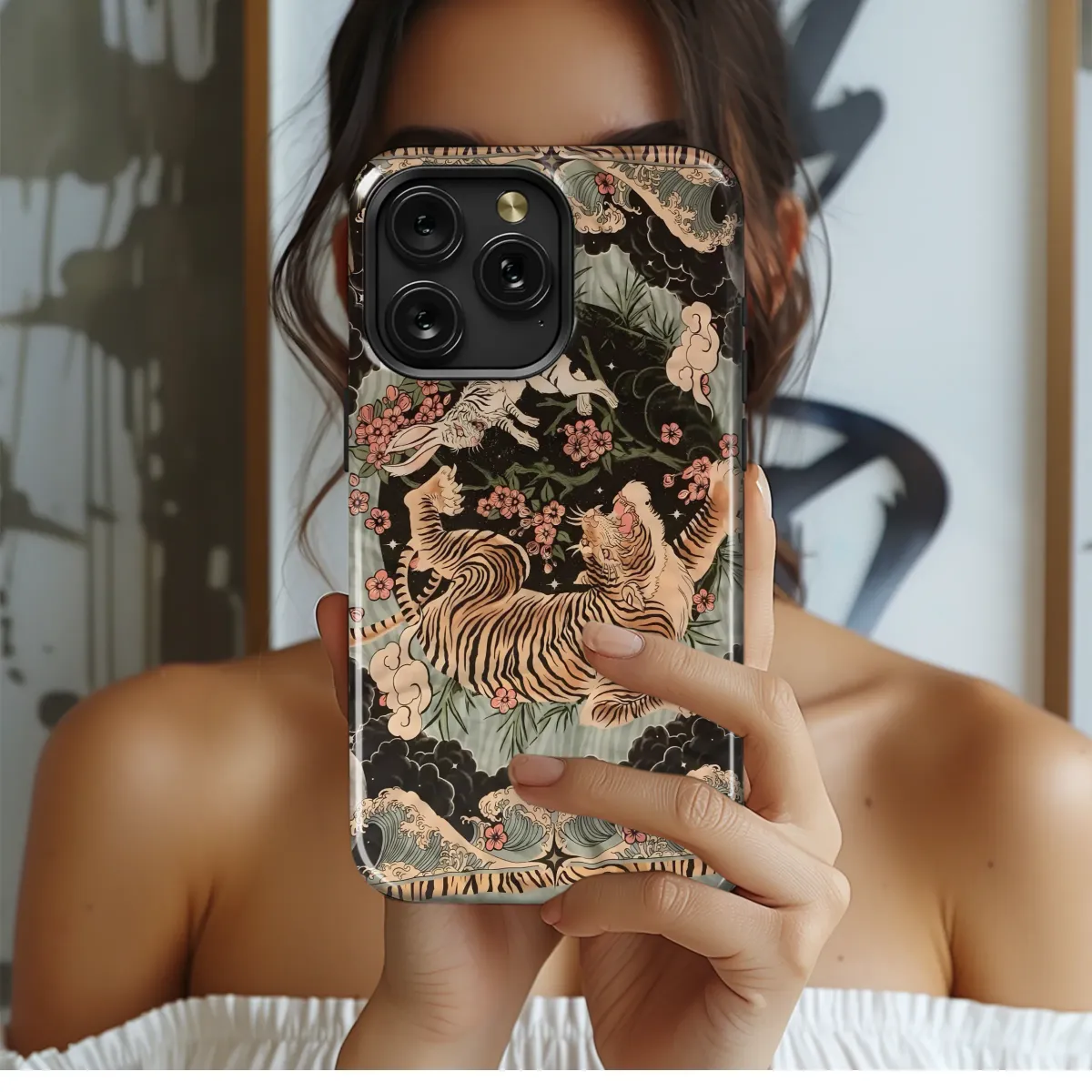 Embrace the mystical allure of this captivating design, featuring a majestic tiger amidst a serene landscape. Intricate details showcase a playful white rabbit nestled amongst blossoming cherry branches, all set against a backdrop of rolling waves and a starry night sky. The rich, earthy tones and artistic style create a unique aesthetic, blending elements of Japanese woodblock prints and modern illustration. This piece is perfect for adding a touch of elegance and mystery to your personal style, making a statement that's both bold and beautiful. The high-quality print ensures vibrant colors and crisp lines that will last. This design is a conversation starter, a reflection of individuality, and a timeless piece of wearable art that will complement any outfit and elevate your everyday look. Its versatile design transcends trends, ensuring it remains a cherished accessory for years to come. This striking artwork is sure to garner compliments and spark imaginative conversations, reflecting your unique sense of style and appreciation for exquisite design. Order yours today and experience the captivating charm of this extraordinary piece.