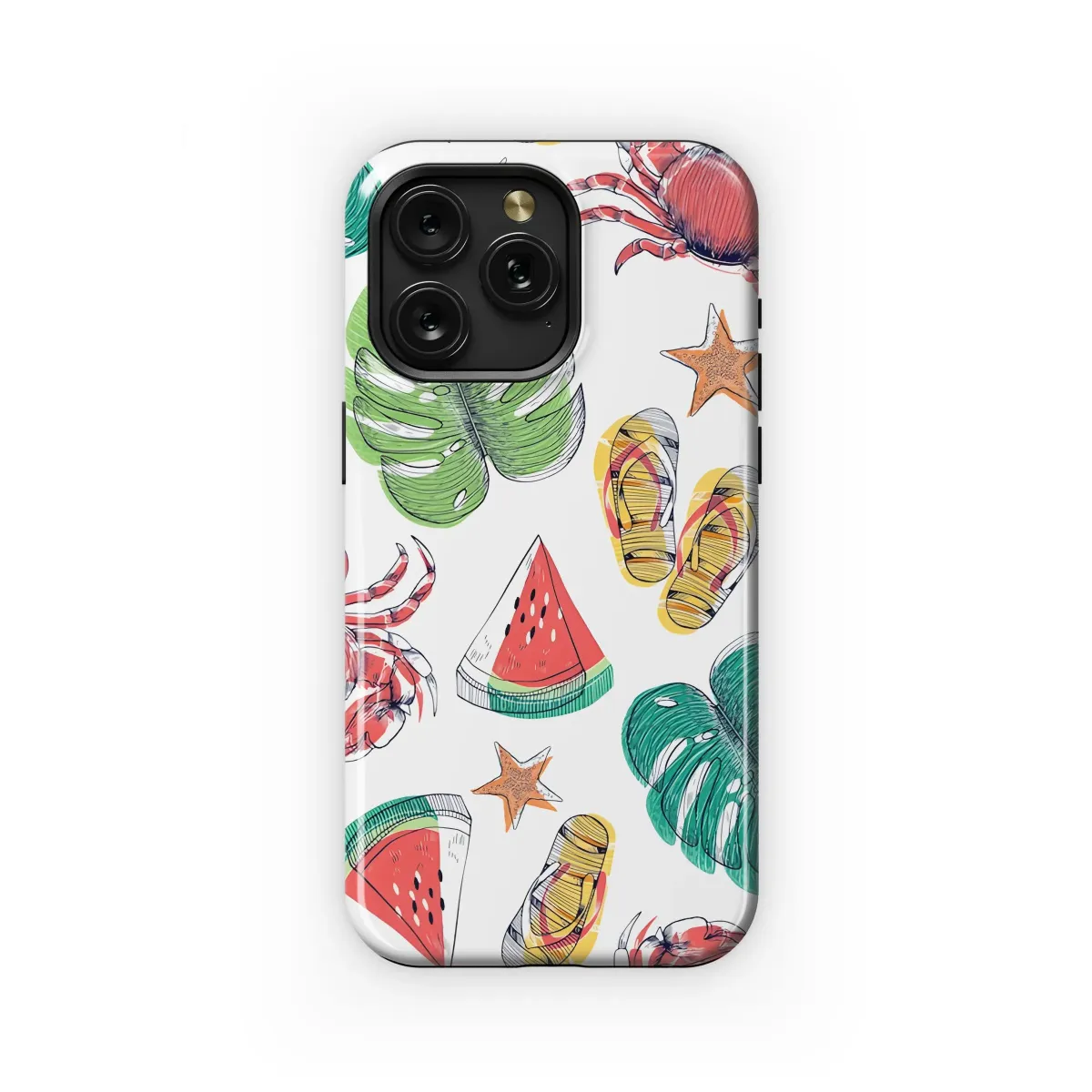 Escape to a tropical paradise with this vibrant, hand-drawn summer pattern. Featuring a lively mix of coastal elements, this seamless design captures the essence of a beach getaway. Discover intricately sketched red crabs, lush green monstera leaves, playful orange starfish, refreshing watermelon slices, and colorful yellow and pink flip-flop sandals scattered across a clean white background. The artistic sketch style gives each element a unique, dynamic feel, brought to life by a bright, eye-catching color palette. Perfect for adding a touch of sunny charm and ocean-inspired beauty to your everyday items or creative projects. This repeating motif brings the joy of holidays and the beauty of nature right to you. Imagine this delightful array on your favorite accessories, home decor pieces, or crafts, instantly transporting you to sandy shores and warm breezes. The detailed illustrations and harmonious blend of beach and botanical themes make this a truly special and versatile print. Whether you're dreaming of a tropical vacation or simply love ocean life and exotic plants, this charming design is sure to brighten your day and add a splash of summer fun wherever it's used. It's a little piece of paradise, captured in a beautiful artistic rendering, ready to infuse your world with coastal flair and cheerful vibes. This unique pattern is ideal for those seeking a playful, summery aesthetic with an artistic touch, offering endless possibilities for bringing a touch of the tropics into your life through various printed applications.