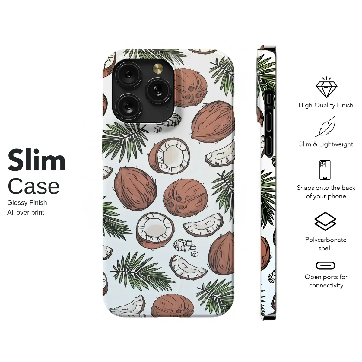 Capture the essence of a beach getaway with this artistic phone case featuring a hand-drawn coconut and palm leaf pattern. This tropical design is perfect for adding a touch of summer to your daily routine while keeping your device safe. Inspired by island life and sunny days, the vibrant, detailed illustration brings a unique, natural vibe to your tech. It’s an ideal accessory for anyone who loves botanical art, tropical fruit, or a laid-back aesthetic. Key Features: • Materials: Made from durable, flexible Thermoplastic Polyurethane (TPU) for impact absorption. • Printing: High-quality UV printing ensures the design is vibrant and won't fade or scratch easily. • Protection: A slim profile provides protection against everyday bumps and drops without adding bulk. • Compatibility: Available for most iPhone, Samsung Galaxy, and Google Pixel models. • Care: Simply wipe clean with a soft, damp cloth to keep it looking fresh.