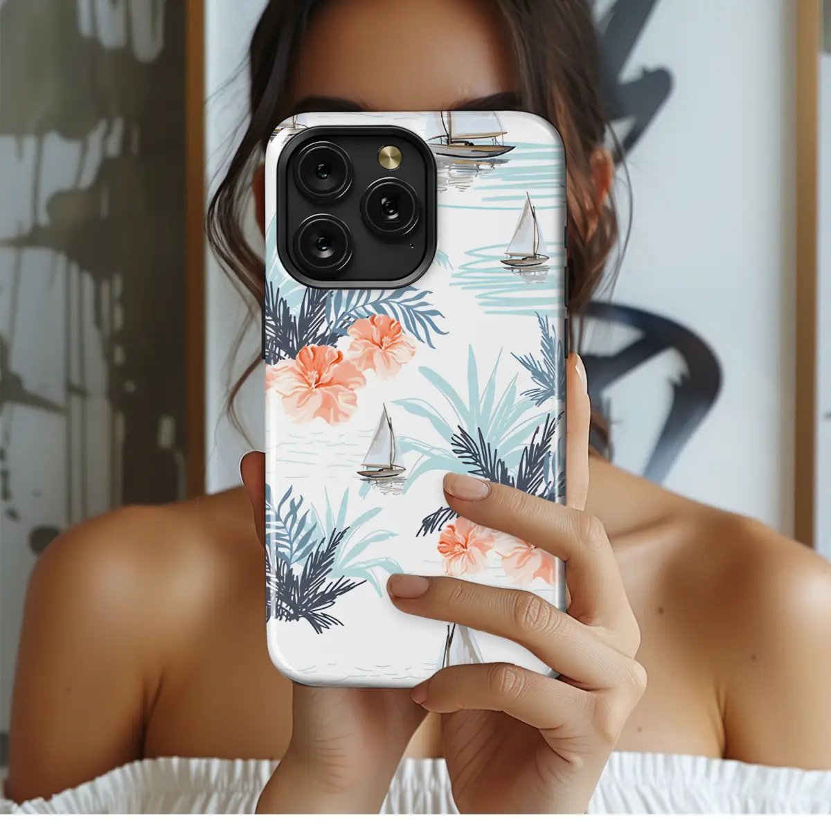 Escape to a tropical paradise with our vibrant phone case featuring a picturesque coconut palm, sailboat, and hibiscus design. Crafted with precision, this cover ensures your device is shielded from drops and scratches while adding a touch of island-inspired charm to your everyday style. The slim profile allows for seamless pocketing and wireless charging, making it the perfect companion for the beach or beyond.