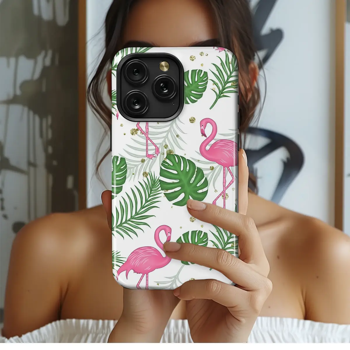 Step into a sun-drenched, whimsical paradise with this stunning tropical artwork. Imagine elegant pink flamingos, with their graceful curves and vibrant plumage, wading through a dreamy island landscape. They are surrounded by a lush canopy of botanical wonders, from the deep green of bold monstera leaves to the delicate, feathery fronds of palm trees swaying in a gentle breeze. The design creates a beautiful sense of depth and life, making you feel as though you could step right into the scene. To add a touch of magic and sophisticated glam, a playful scattering of faux gold glitter is sprinkled throughout, catching the light like sunbeams dancing on water. This vibrant flamingo and palm leaf pattern is an instant mood-booster, perfect for anyone who loves a chic, preppy aesthetic with a touch of whimsy. It’s an ideal way to carry the feeling of an endless summer vacation with you wherever you go. Let this joyful and nature-inspired design transform your most-used essential into a statement piece that showcases your bright personality. It’s not just an accessory; it’s your personal slice of paradise, a beautiful gift for her or a delightful treat for yourself that brings island vibes to your daily routine.
