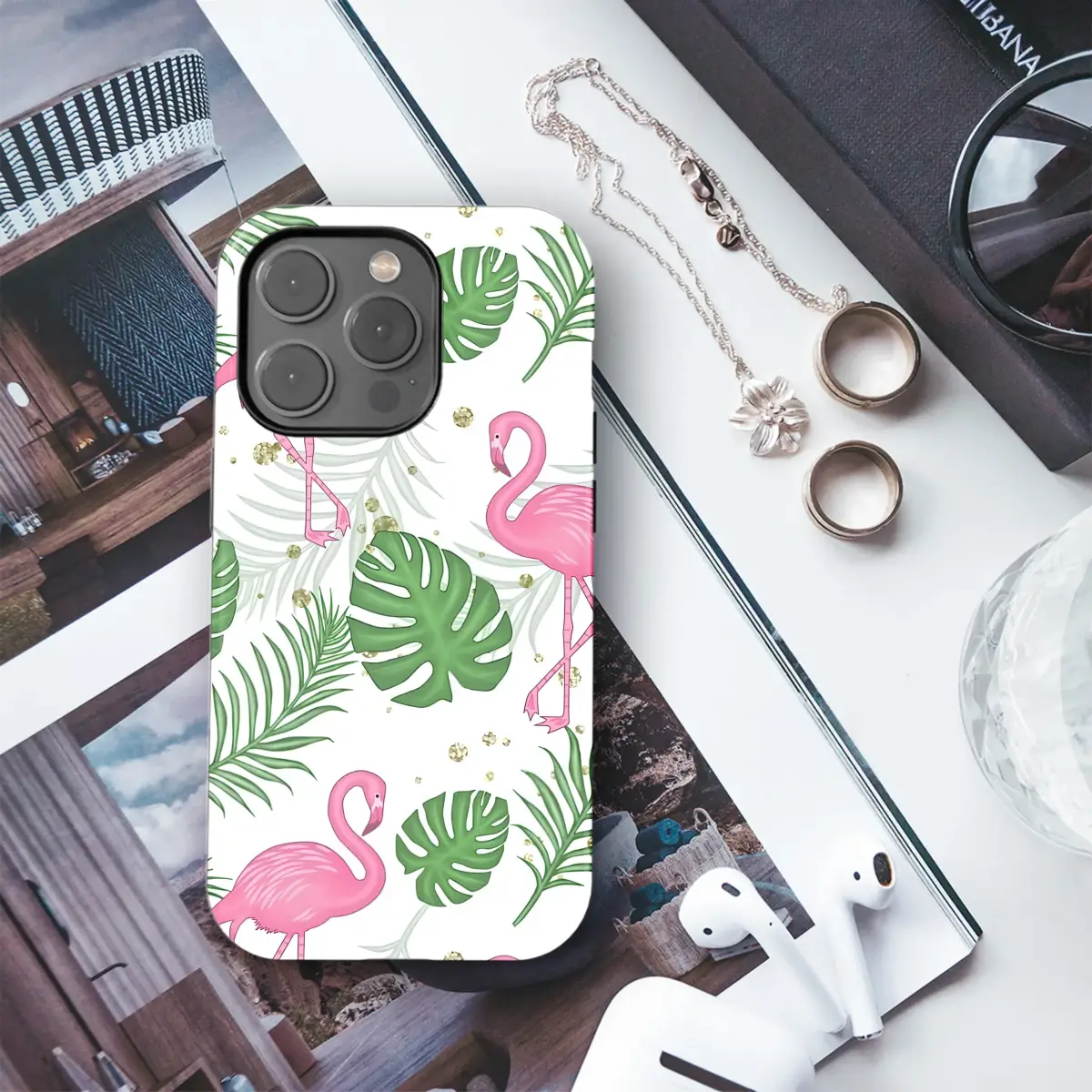 Step into a sun-drenched, whimsical paradise with this stunning tropical artwork. Imagine elegant pink flamingos, with their graceful curves and vibrant plumage, wading through a dreamy island landscape. They are surrounded by a lush canopy of botanical wonders, from the deep green of bold monstera leaves to the delicate, feathery fronds of palm trees swaying in a gentle breeze. The design creates a beautiful sense of depth and life, making you feel as though you could step right into the scene. To add a touch of magic and sophisticated glam, a playful scattering of faux gold glitter is sprinkled throughout, catching the light like sunbeams dancing on water. This vibrant flamingo and palm leaf pattern is an instant mood-booster, perfect for anyone who loves a chic, preppy aesthetic with a touch of whimsy. It’s an ideal way to carry the feeling of an endless summer vacation with you wherever you go. Let this joyful and nature-inspired design transform your most-used essential into a statement piece that showcases your bright personality. It’s not just an accessory; it’s your personal slice of paradise, a beautiful gift for her or a delightful treat for yourself that brings island vibes to your daily routine.