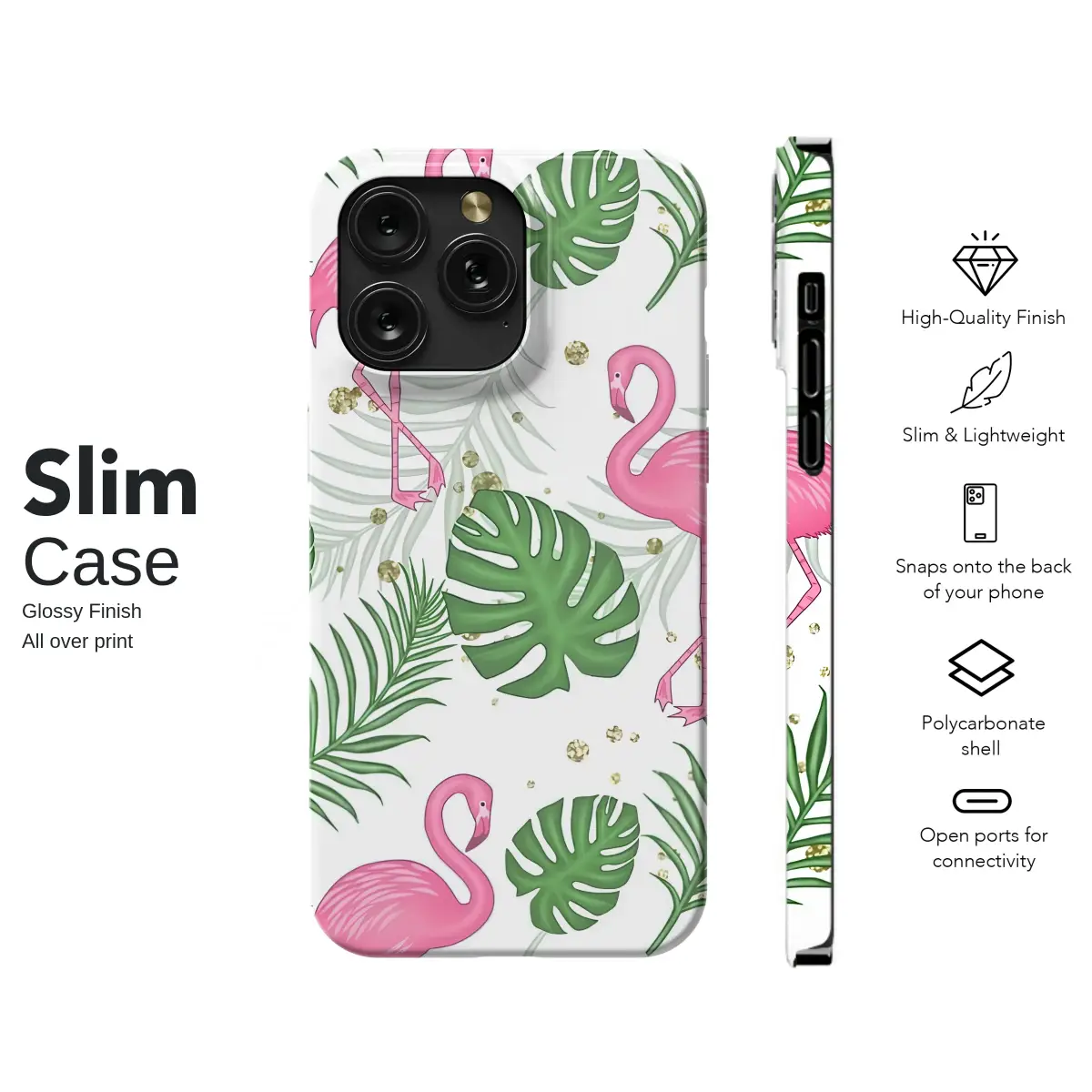 Step into a sun-drenched, whimsical paradise with this stunning tropical artwork. Imagine elegant pink flamingos, with their graceful curves and vibrant plumage, wading through a dreamy island landscape. They are surrounded by a lush canopy of botanical wonders, from the deep green of bold monstera leaves to the delicate, feathery fronds of palm trees swaying in a gentle breeze. The design creates a beautiful sense of depth and life, making you feel as though you could step right into the scene. To add a touch of magic and sophisticated glam, a playful scattering of faux gold glitter is sprinkled throughout, catching the light like sunbeams dancing on water. This vibrant flamingo and palm leaf pattern is an instant mood-booster, perfect for anyone who loves a chic, preppy aesthetic with a touch of whimsy. It’s an ideal way to carry the feeling of an endless summer vacation with you wherever you go. Let this joyful and nature-inspired design transform your most-used essential into a statement piece that showcases your bright personality. It’s not just an accessory; it’s your personal slice of paradise, a beautiful gift for her or a delightful treat for yourself that brings island vibes to your daily routine.