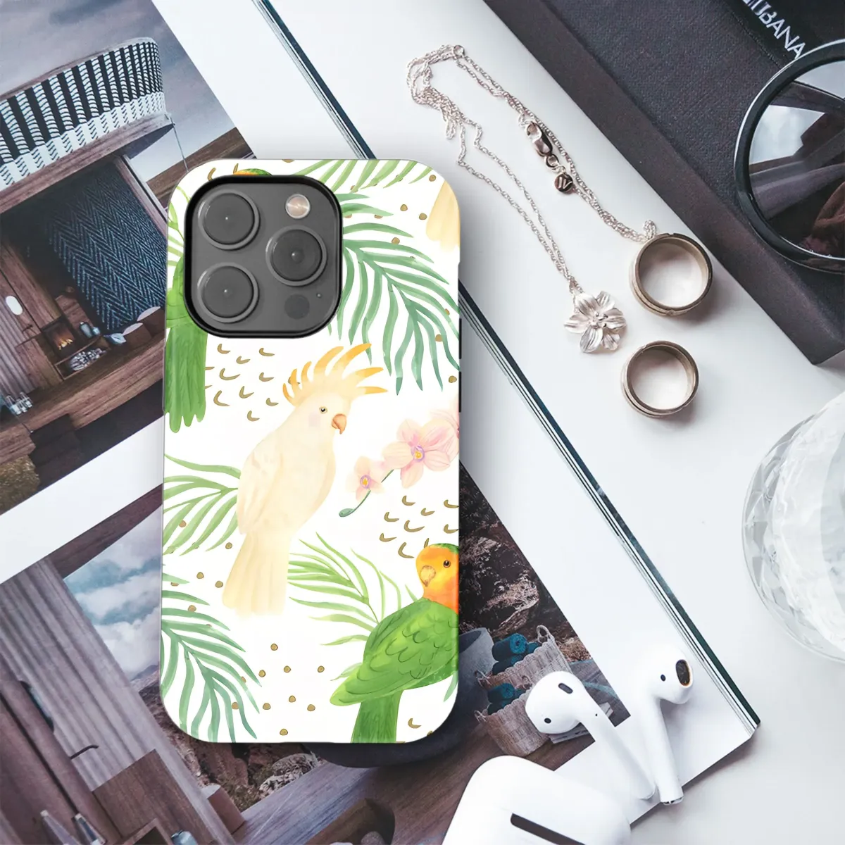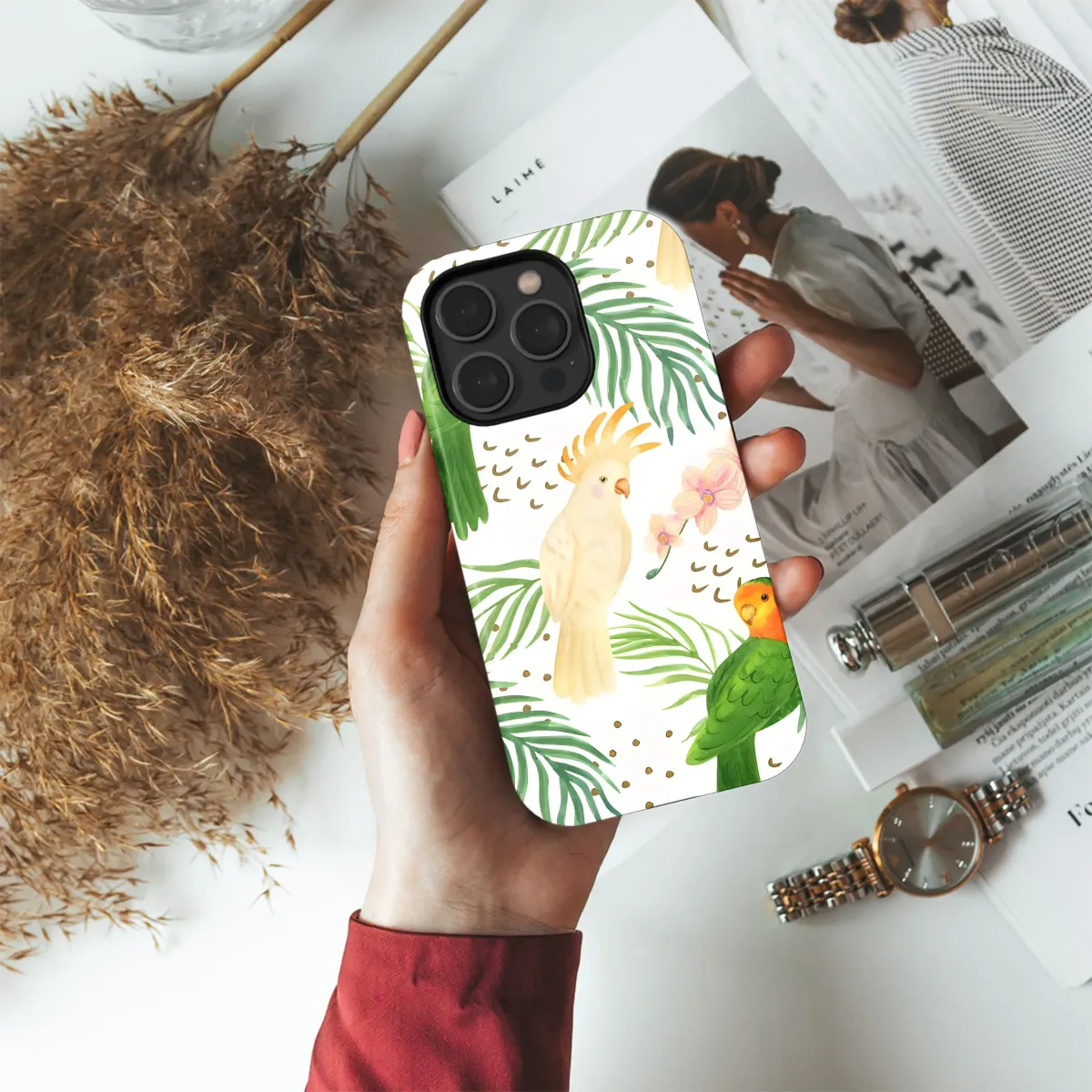 Immerse yourself in the vibrant world of the tropics with this stunning watercolor pattern. Featuring colorful green and orange parrots perched amongst lush palm fronds, elegant white cockatoos, and delicate pink orchids, this design is a true celebration of exotic beauty. Subtle gold confetti dots are scattered throughout, adding a touch of playful sparkle. Rendered in a charming hand-painted watercolor style, this seamless pattern brings the joyful energy and rich biodiversity of a tropical paradise to life. It's the perfect way to infuse your everyday with a splash of nature, wildlife, and vibrant color. This design is wonderfully suited for adding a unique, eye-catching touch to personal items. It’s ideal for anyone who adores tropical themes, botanical art, wildlife motifs, or simply craves a touch of vibrant color and exotic charm in their daily life. Let this cheerful, artistic print transport you to a sun-drenched jungle escape, transforming an ordinary accessory into a statement piece that reflects your love for adventure, nature, and artistic flair. It’s a little slice of paradise to brighten every moment, designed to make your favorite item pop with personality and style. Perfect for a boho, maximalist, or nature-inspired aesthetic.