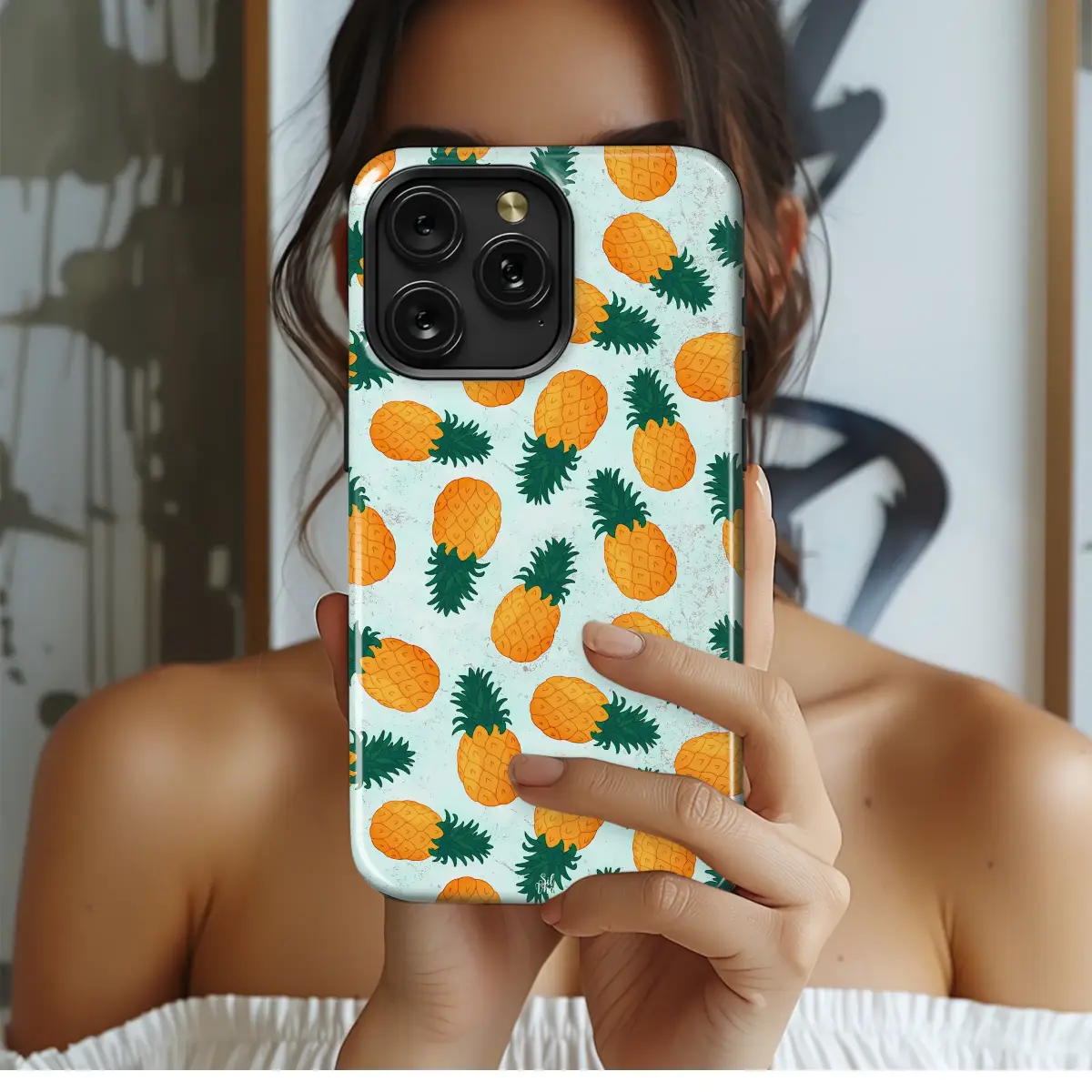 Escape to a sun-drenched paradise every day with this vibrant and playful artwork. Imagine the feeling of warm sand and a cool breeze as you gaze upon this cheerful pattern of golden pineapples scattered against a refreshing mint-green backdrop. Each fruit is rendered in a fun, pop-art style with a hint of retro texture, giving it a unique, hand-drawn character that’s full of personality. This design isn't just an accessory; it's a mood-booster, a tiny piece of endless summer you can carry with you. Let the bright yellow and lush green hues infuse your daily routine with a dose of tropical bliss and carefree vacation vibes. It’s the perfect way to personalize your most essential gadget, transforming it into a statement of joy and wanderlust. An ideal gift for the sunshine seeker, the fruit lover, or anyone who wants to add a splash of happy color and aloha spirit to their life. Embrace the sweet life and let this delightful design be a daily reminder to stand tall, wear a crown, and be sweet on the inside.