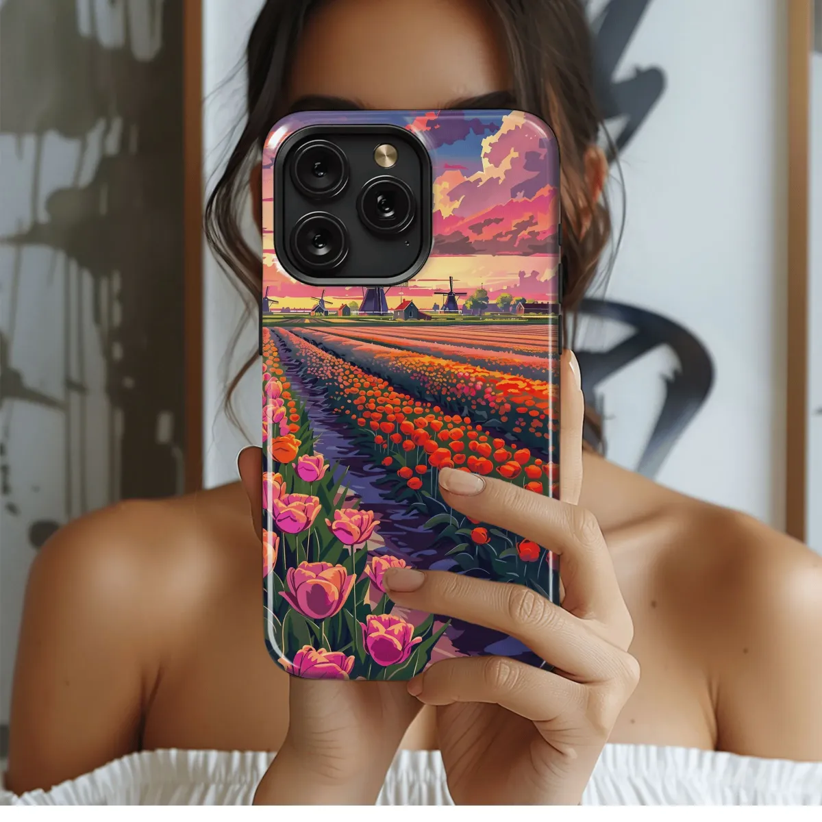 Immerse yourself in the captivating beauty of a sunset across endless tulip fields with this exquisite phone case. The vibrant hues of pink, orange, and purple dance across the sky, casting a breathtaking glow upon the landscape. As the sun dips below the horizon, its golden rays illuminate the delicate petals of the tulips, creating an ethereal and romantic scene. Protect your phone with this breathtaking case and carry a piece of nature's artistry with you wherever you go.