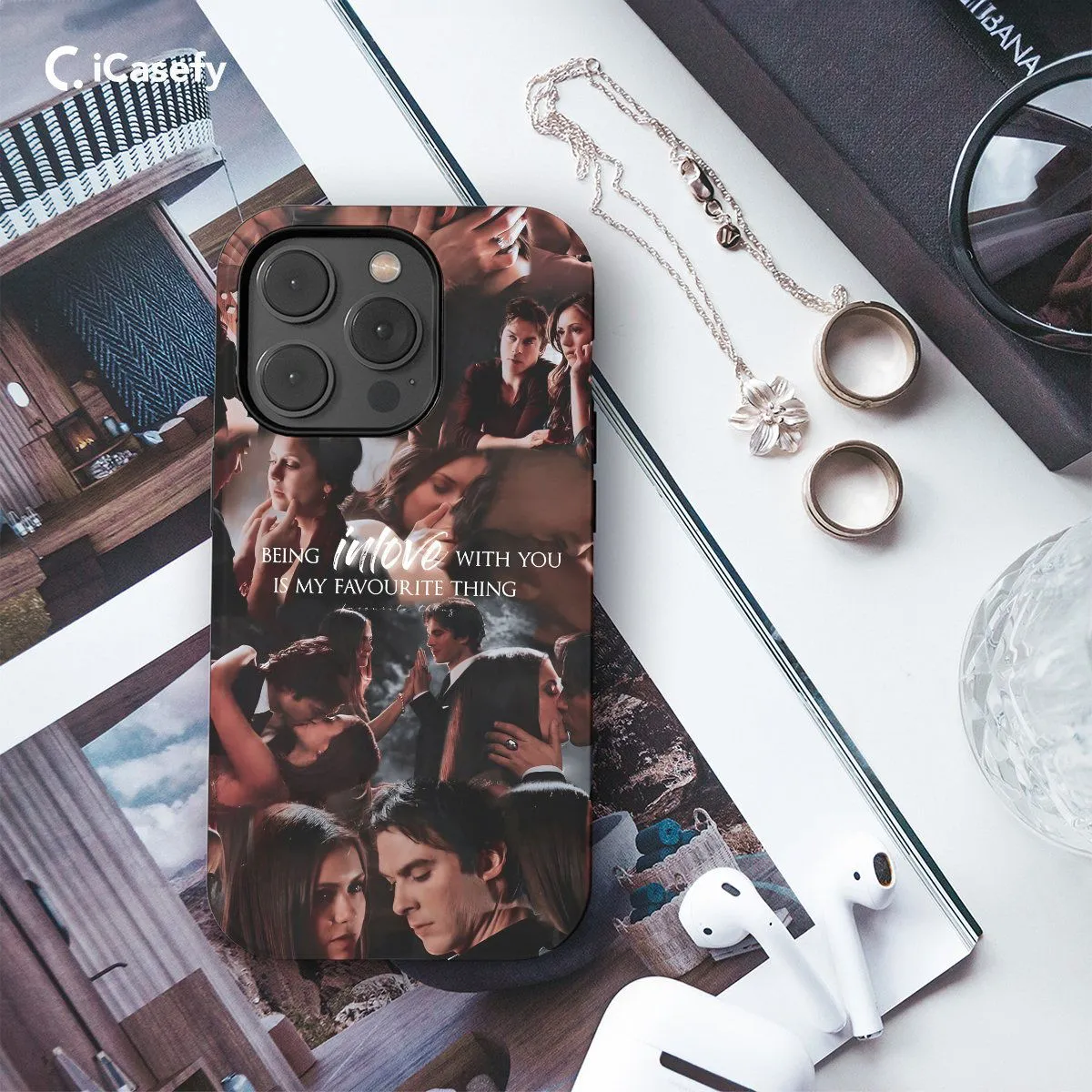 Celebrate the charismatic enigma of Damon Salvatore with this captivating phone case featuring a collage of iconic moments and quotes from The Vampire Diaries. From his brooding intensity to his moments of vulnerability, this accessory pays homage to Damon's complex and compelling character. Carry a piece of Mystic Falls with you wherever you go and let your device become a tribute to the charm and complexity of this beloved character with this stylish and meaningful case.