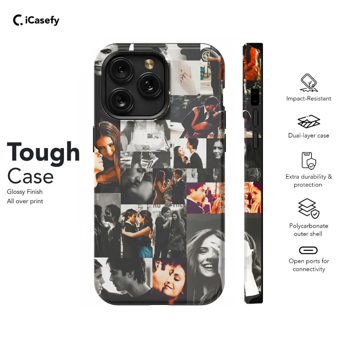 Celebrate the charismatic allure of Damon Salvatore with this captivating phone case showcasing a collage of iconic moments from The Vampire Diaries. From smoldering gazes to unforgettable quotes, this case pays homage to the complexity and charm of the character throughout the series. Carry a piece of Mystic Falls with you wherever you go and let your device reflect your eternal love for the timeless saga of TVD.