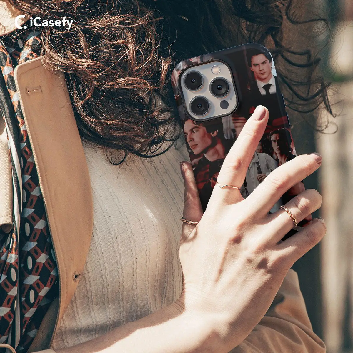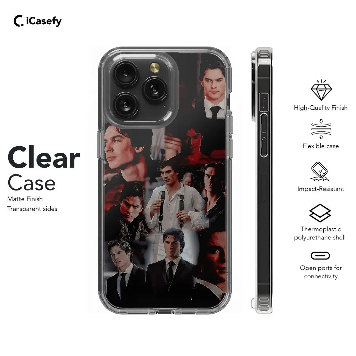 Embrace the charismatic allure of Damon Salvatore from The Vampire Diaries with this captivating phone case featuring a collage of iconic moments from the series. From his smoldering gaze to his moments of vulnerability and redemption, this case pays homage to Damon's complex character arc. Carry a piece of Mystic Falls with you wherever you go and let your device showcase your admiration for this beloved vampire with this stylish accessory.