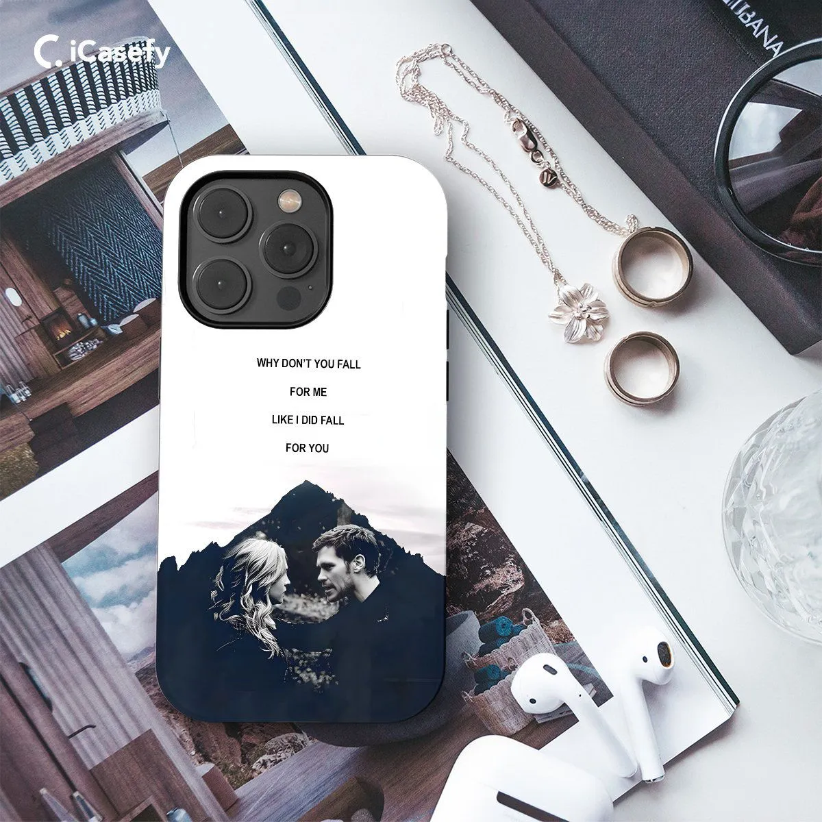 Capture the mystique of Mystic Falls with a phone case adorned with a quote from The Vampire Diaries set against a backdrop of majestic mountains. This design pays homage to the enchanting landscapes and captivating storyline of the beloved series. Carry a piece of the supernatural world of Mystic Falls with you wherever you go and let your device become a reminder of the epic adventures and enduring friendships found in The Vampire Diaries.