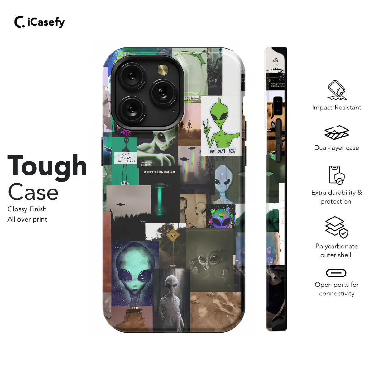 Embark on a journey into the mysterious cosmos with our UFO Collage phone case. This captivating design showcases a mesmerizing collage of unidentified flying objects against a backdrop of swirling galaxies and twinkling stars. Crafted with precision, it features precise cutouts for easy access to ports and buttons, ensuring functionality without compromising style. With its slim profile and durable construction, it offers reliable protection against daily wear and tear. Illuminate your device with the intrigue of extraterrestrial encounters and let your imagination soar with our UFO Collage phone case. Order now and prepare for an out-of-this-world experience!