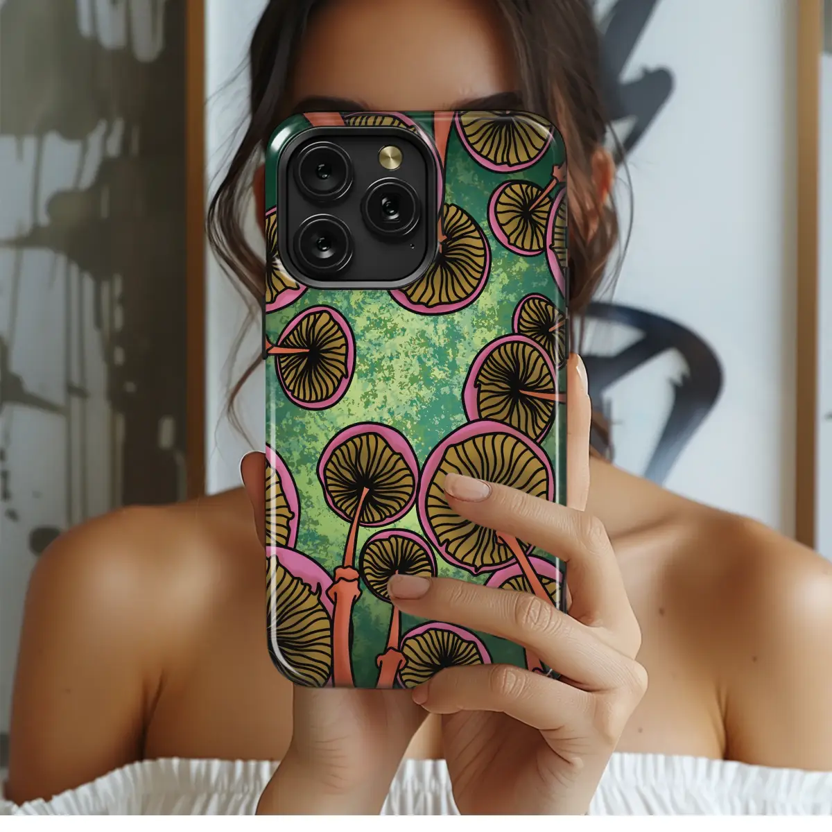 Wander into an enchanted forest every time you reach for your most essential companion. Gaze up from the mossy ground at a magical canopy of psychedelic mushrooms, their vibrant, bubblegum pink caps glowing against a textured, groovy green sky. Each toadstool is a miniature world of its own, with intricate, maze-like gills rendered in warm ochre and bold black lines, giving the entire design a trippy, illustrated feel that pops with retro energy. This unique, artist-designed piece is a perfect slice of nature for the modern-day fairy, the cottagecore dreamer, or the goblincore adventurer who loves to get lost in the woods. Let this mystical fungi art be a whimsical guardian for your daily tech, wrapping your device in a protective layer of otherworldly charm and personality. It’s the ultimate aesthetic gift for any mycology enthusiast or nature lover, a little piece of 70s-inspired botanical magic that makes a bold, artistic statement wherever you go, transforming your everyday carry into a pocket-sized portal to another realm.