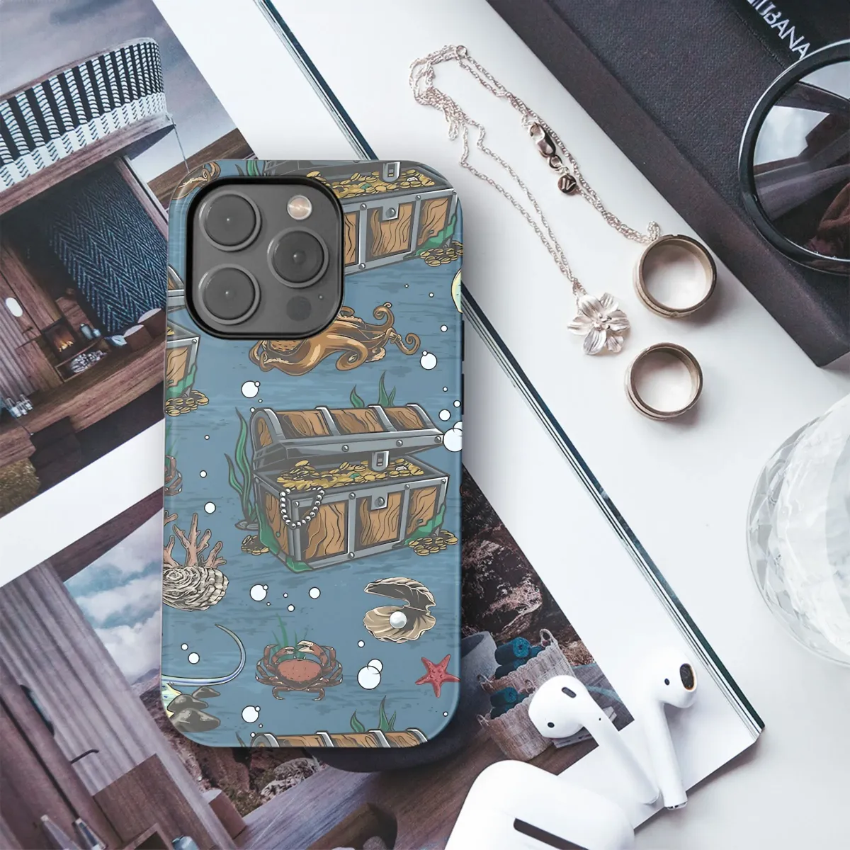 Dive into an underwater adventure with this captivating design, perfect for adding a touch of nautical charm to your favorite device. This vibrant artwork features a treasure trove of marine life, including detailed illustrations of treasure chests overflowing with gold doubloons, graceful stingrays gliding through the water, and curious octopuses exploring the depths. Alongside these, you'll find intricate coral formations, delicate pearl-bearing oysters, and charming starfish, all brought together by the constant stream of bubbles rising to the surface. The rich color palette and detailed artwork evoke a sense of mystery and exploration, making this design a unique and eye-catching accessory. It's perfect for anyone who loves the ocean, pirate lore, or simply appreciates intricate and visually stunning art. This design is an ideal gift for the seafaring soul, or a unique way to express your own sense of adventure and love for the sea. Let this underwater fantasy transform your daily experience with its unique aesthetic, sure to inspire stories and spark conversations wherever you go.