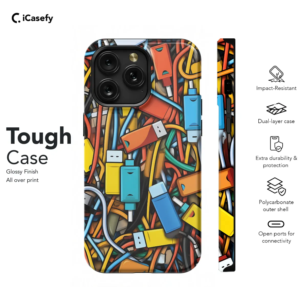 **Charge and Protect in Style** Upgrade your everyday essentials with this versatile USB Wires Phone Case. Compatible with iPhone, Samsung, Pixel, and more*, it seamlessly charges your device while safeguarding it from bumps and scratches. * **Fast and Effortless Charging:** The integrated USB-C cable allows for quick and convenient charging without the hassle of tangling wires. * **Durable Protection:** The rugged case protects your phone from accidental drops, bumps, and daily wear and tear, ensuring its longevity. * **Versatile Compatibility:** Compatible with a wide range of popular phone models, so you can use it with your favorite device. * **Stylish Design:** Available in a sleek black color that complements any outfit and adds a touch of sophistication. Stay connected and protected with the ultimate charging solution for your smartphone.