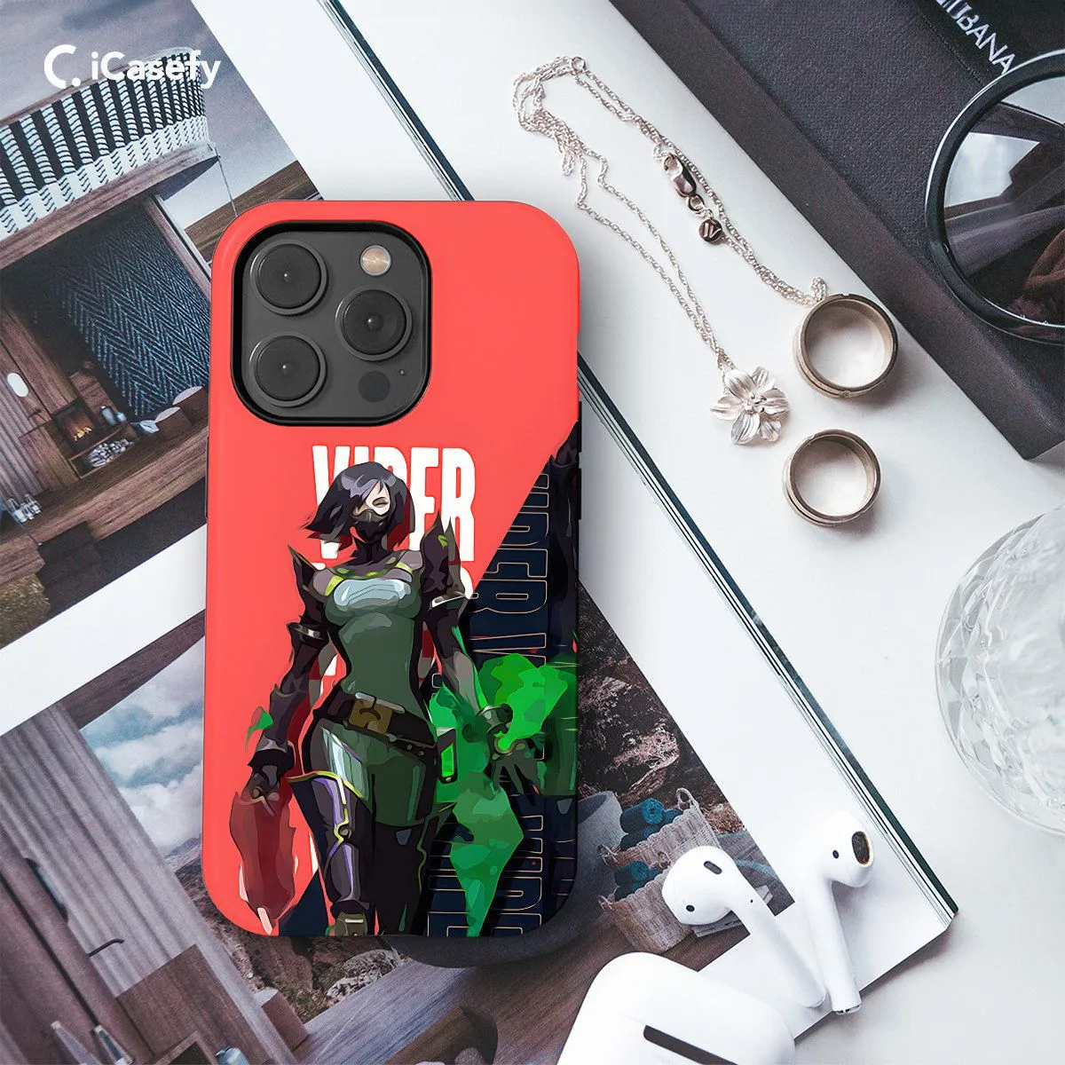 Enter the tactical realm of Valorant with this sleek phone case featuring Viper, the venomous controller agent. With her toxic abilities and strategic utility, Viper dominates the battlefield with deadly precision. Show your affinity for this cunning agent and the thrilling gameplay of Valorant wherever you go with this stylish accessory, perfect for any fan of the game.