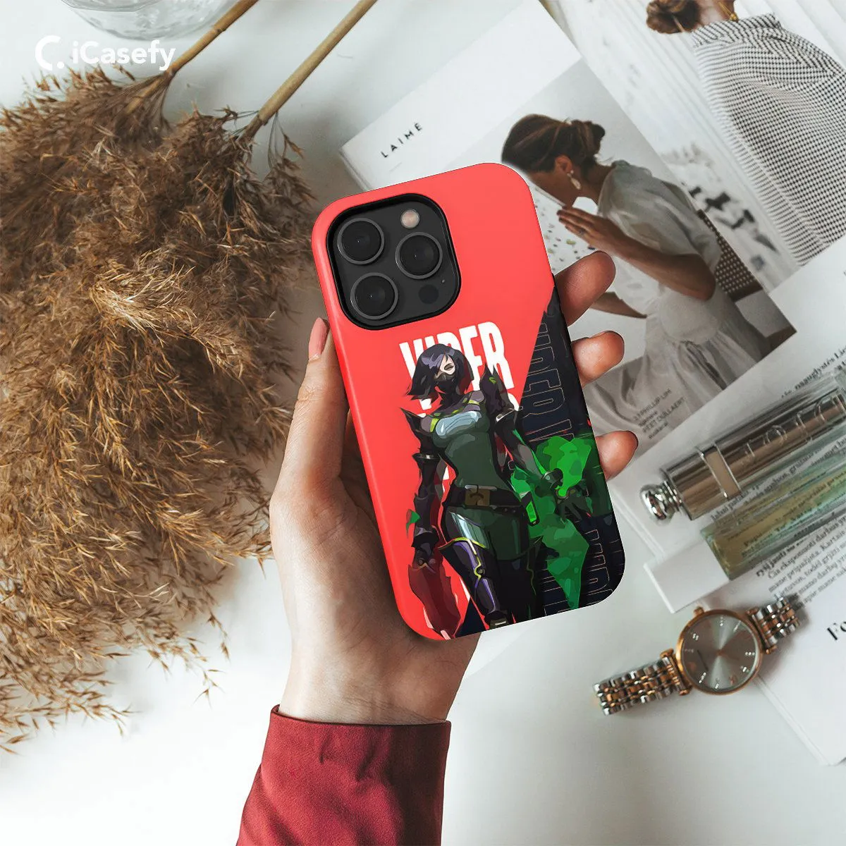 Enter the tactical realm of Valorant with this sleek phone case featuring Viper, the venomous controller agent. With her toxic abilities and strategic utility, Viper dominates the battlefield with deadly precision. Show your affinity for this cunning agent and the thrilling gameplay of Valorant wherever you go with this stylish accessory, perfect for any fan of the game.