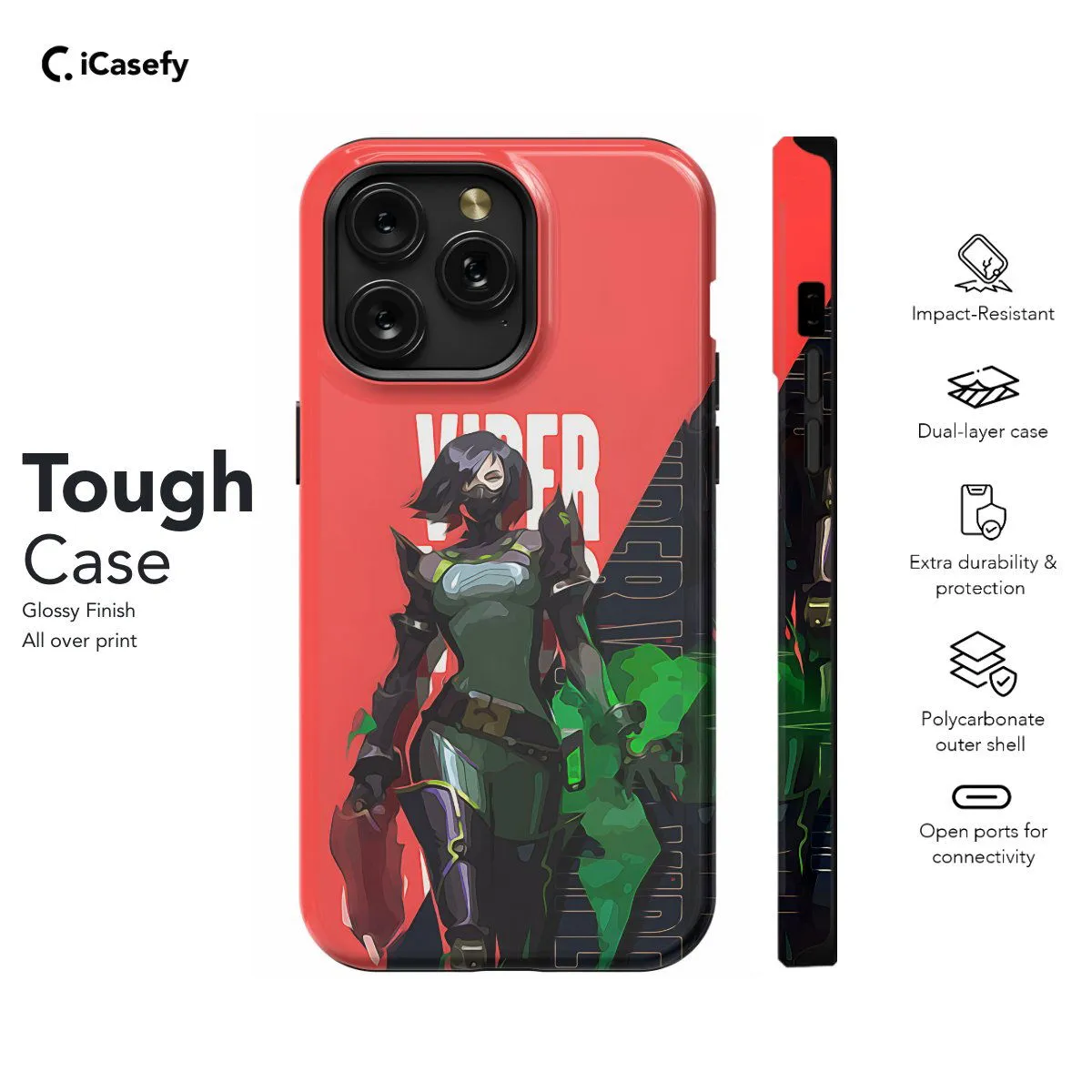 Enter the tactical realm of Valorant with this sleek phone case featuring Viper, the venomous controller agent. With her toxic abilities and strategic utility, Viper dominates the battlefield with deadly precision. Show your affinity for this cunning agent and the thrilling gameplay of Valorant wherever you go with this stylish accessory, perfect for any fan of the game.
