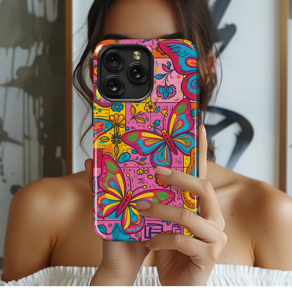 Embrace vibrant, bohemian style with this dazzling design featuring a kaleidoscope of colorful butterflies and flourishing florals. The bold, hand-drawn aesthetic creates a playful yet sophisticated look, perfect for adding a pop of personality to your everyday essentials. This lively print showcases a captivating mix of hot pinks, sunny yellows, and electric blues, making it a true statement piece. The intricate details and energetic composition are sure to turn heads and spark conversation. Infuse your personal style with this unique and eye-catching artwork, showcasing a joyful explosion of color and artistic expression. This design is printed using high-quality inks for vibrant, long-lasting results, ensuring your new accessory remains stunning wash after wash. Add a touch of whimsical artistry to your life and experience the joy of bold, beautiful design. Perfect for showcasing your individuality and adding a vibrant touch to any outfit or collection. This design is a must-have for anyone who appreciates bold, colorful, and unique art.