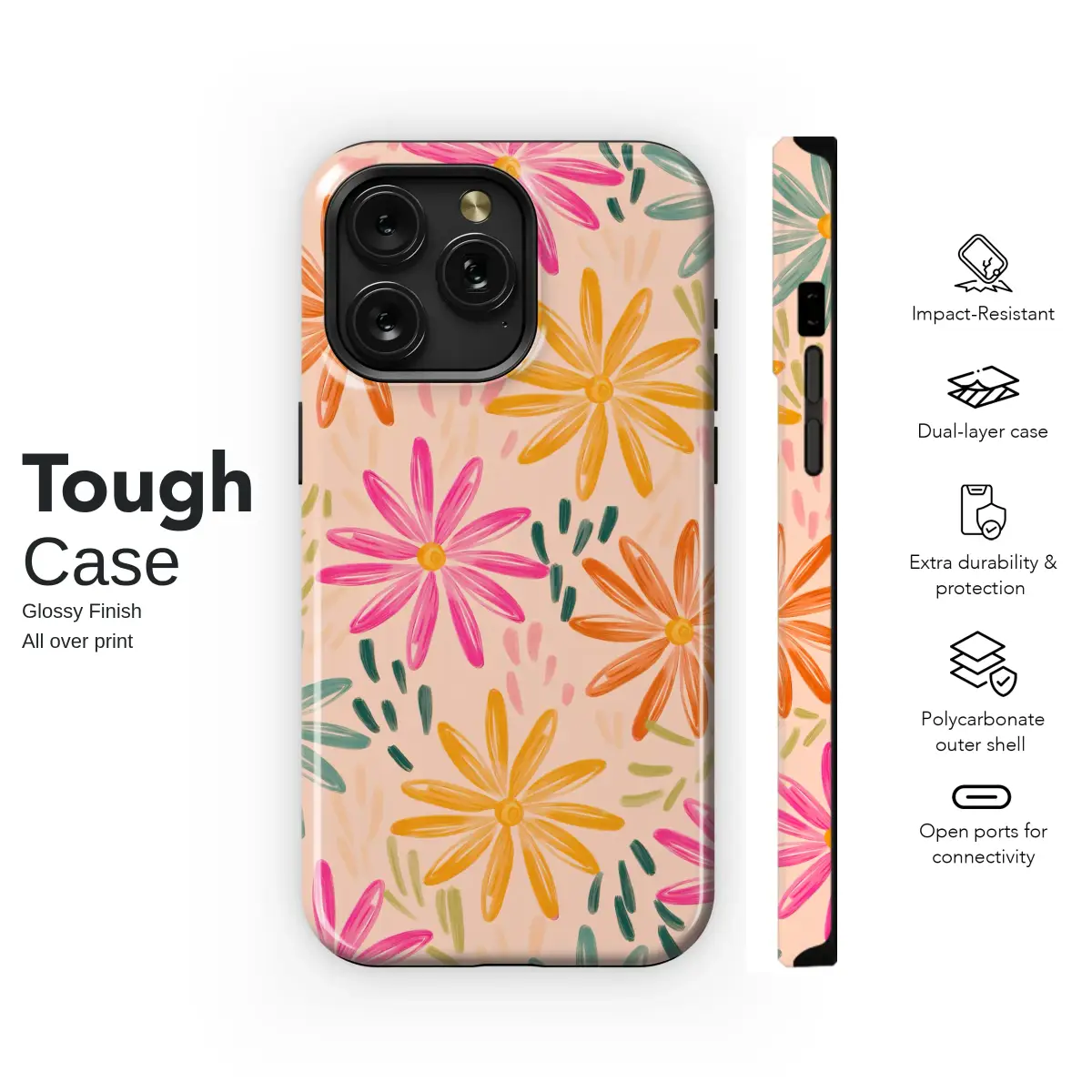 Showcase your style with this cheerful and vibrant floral design. Featuring a playful pattern of hand-drawn doodle daisies in bright shades of pink, orange, yellow, and teal, this design pops against a soft peach background. The retro, groovy aesthetic adds a fun, artistic touch perfect for anyone who loves colorful, happy patterns.