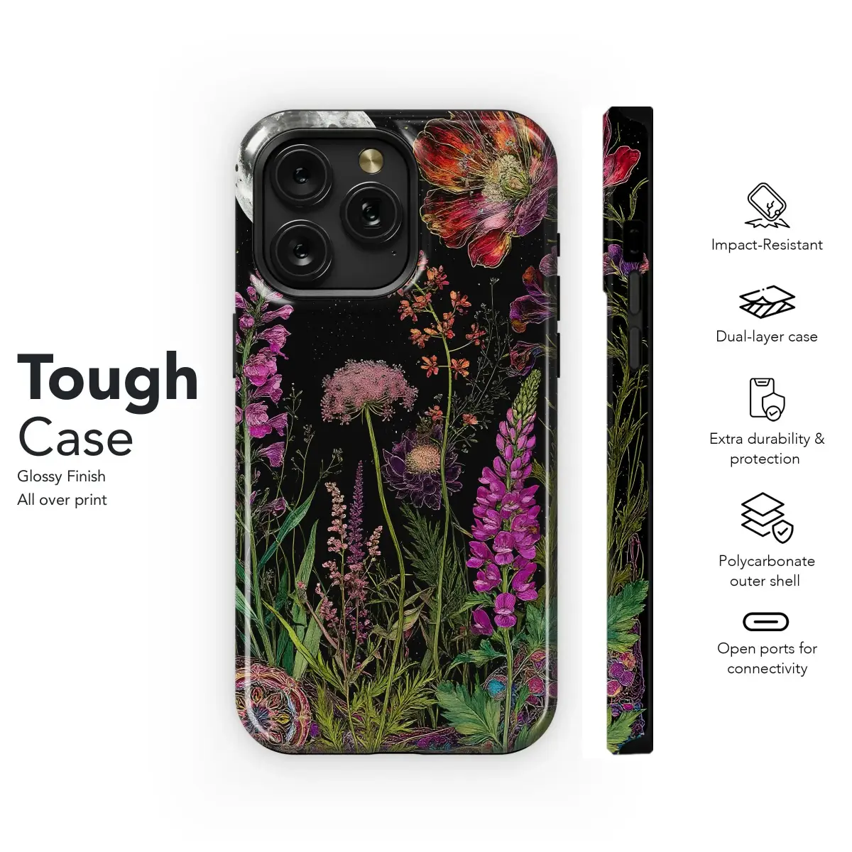 Immerse yourself in the enchanting beauty of this unique illustrative design, capturing the serene magic of a moonlit botanical scene. A breathtakingly detailed full moon glows brilliantly in a deep black, starry night sky, casting its light upon a vibrant, overflowing garden below. This rich tapestry features an eclectic collection of fantastical flowers and diverse plants, rendered in striking hues of magenta, violet, red, orange, and green. Each bloom and leaf bursts with life and color against the dark background, showcasing intricate details and flowing organic forms. The artwork blends the mystical allure of the celestial realm with the wild beauty of nature, creating a truly captivating aesthetic. It evokes a sense of bohemian charm and magical realism, perfect for adding a touch of vibrant artistry to your favorite accessories. This colorful illustration is more than just a design; it's a portable piece of art, a conversation starter that reflects a love for nature, the cosmos, and unique, expressive style. Bring the magic of a starlit garden wherever you go with this eye-catching and beautifully composed visual story.