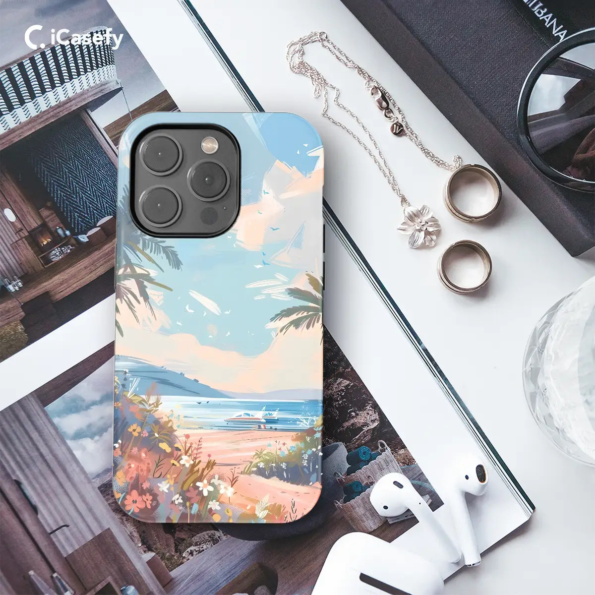 Escape to paradise with our vibrant summer beach phone case! Featuring an enchanting design of swaying palm trees and calming sea waves, this case will transport you to a tropical oasis wherever you go. Protect your phone in style with this premium-quality case that's compatible with iPhone, Samsung, Pixel, and many other models. Its durable construction safeguards your device from bumps and scratches, while the vibrant colors and design will make your phone the envy of the beach.