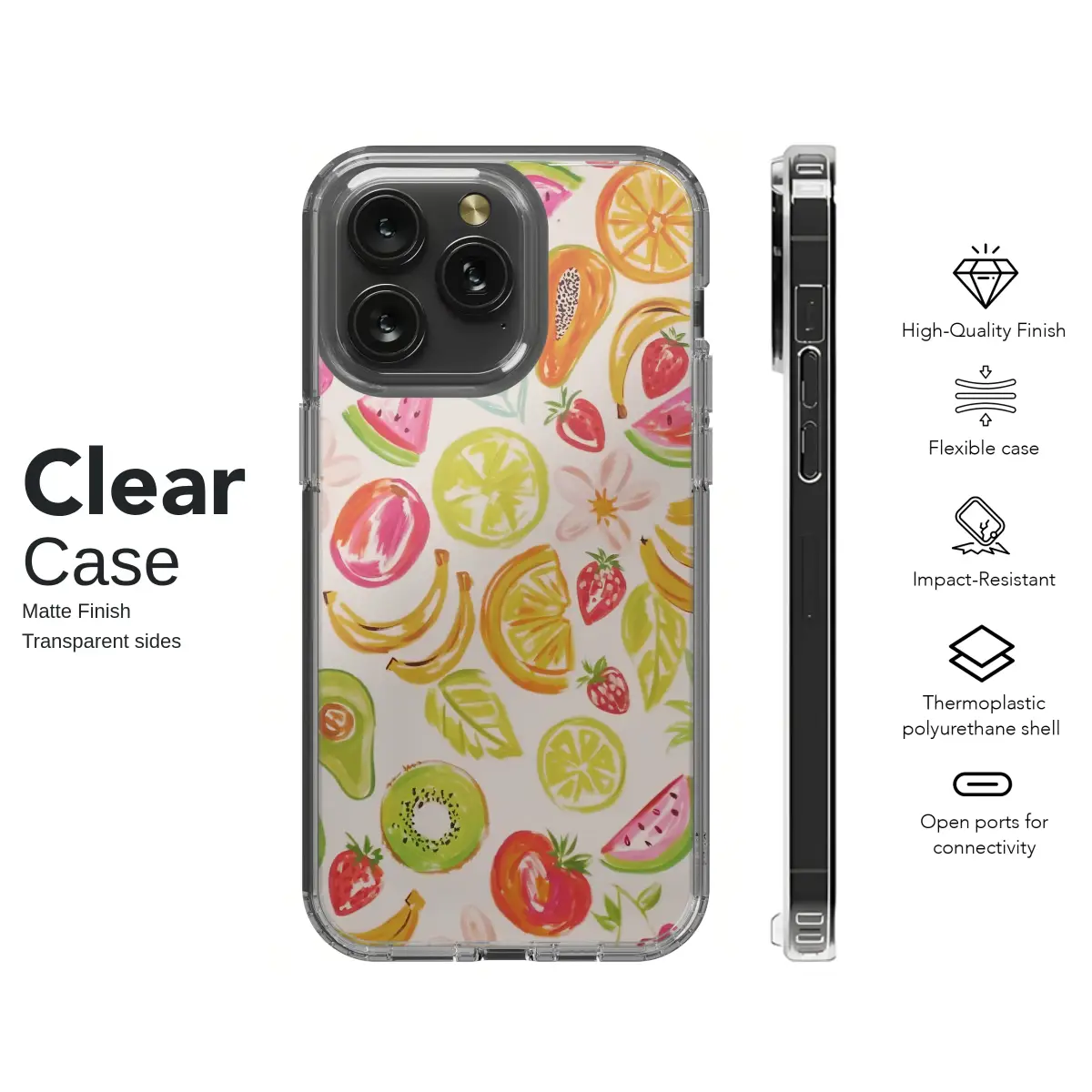 Embrace the spirit of summer with this vibrant, artistic fruit salad design. This cheerful pattern features a hand-painted medley of tropical fruits, including pineapple, avocado, watermelon, and papaya, all rendered in a bright, painterly style. The colorful assortment of fruits and flowers on a clean background creates a playful and energetic look, perfect for anyone who loves bold, fun designs.