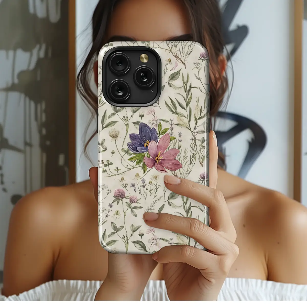 Step into a forgotten secret garden every time you reach for your most essential companion. This enchanting design captures the whimsical soul of a vintage botanical illustration, as if pressed between the pages of a well-loved herbalist’s journal. Delicate sprigs of wild lavender, lucky clover, and sunny chamomile are scattered across a beautifully aged parchment background, evoking a sense of timeless, earthy magic. At its heart, a stunning duo of crocus flowers bloom in rich violet and soft rose, a vibrant whisper of life amidst the gentle greenery. Perfect for the cottagecore romantic, the dark academia dreamer, or anyone who finds peace in the untamed beauty of a wildflower meadow. Let this wearable piece of art serve as your daily shield of nature, transforming your modern-day essential into a token of old-world charm and botanical wonder. It’s more than just a beautiful accessory; it’s a tangible connection to the wild, a little piece of poetry to carry with you on every adventure.