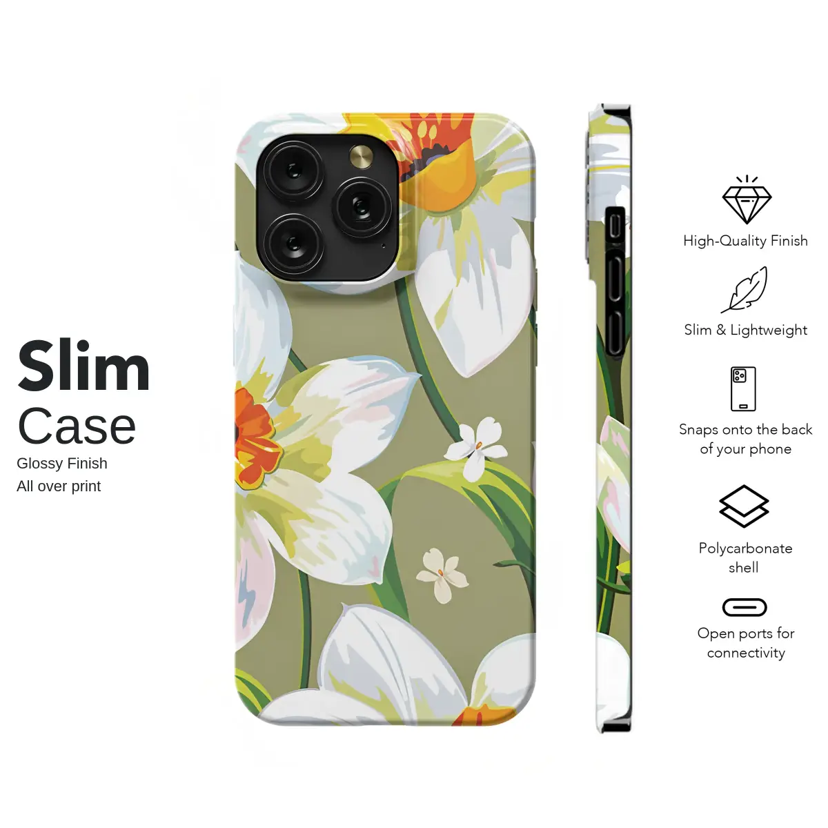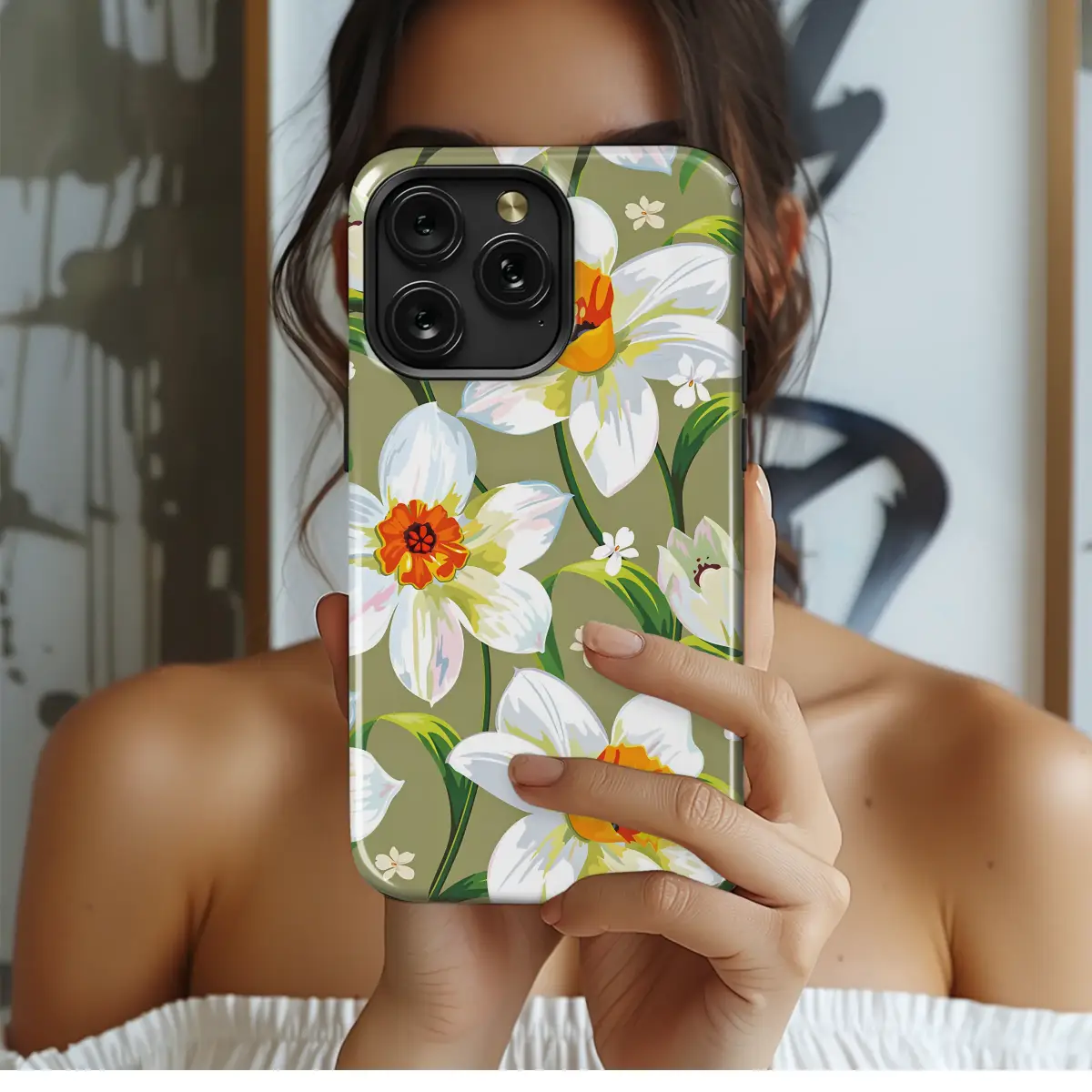 Step into a timeless garden where spring awakens in a symphony of color. This captivating botanical illustration features cheerful daffodils in full, glorious bloom against a sophisticated olive green backdrop. Each flower is a burst of optimism, with crisp, painterly white petals unfurling to reveal a vibrant corona of sun-kissed orange and radiant gold that sings of warmer days. Lush green stems and leaves weave through the composition, creating a sense of life and movement, while tiny, delicate blossoms are scattered throughout, adding a whimsical touch of charm. The art style feels both modern and nostalgic, making it a perfect piece of vintage-inspired floral art. This cottagecore aesthetic design is for the nature lover and the dreamer—a way to carry a pocketful of sunshine wherever you go. Adorn your favorite essential with this beautiful narcissus flower artwork to brighten your daily routine and serve as a constant reminder of nature's simple, profound beauty. It's the ideal nature lover gift, bringing a touch of botanical elegance and a pop of joyful color to your everyday.