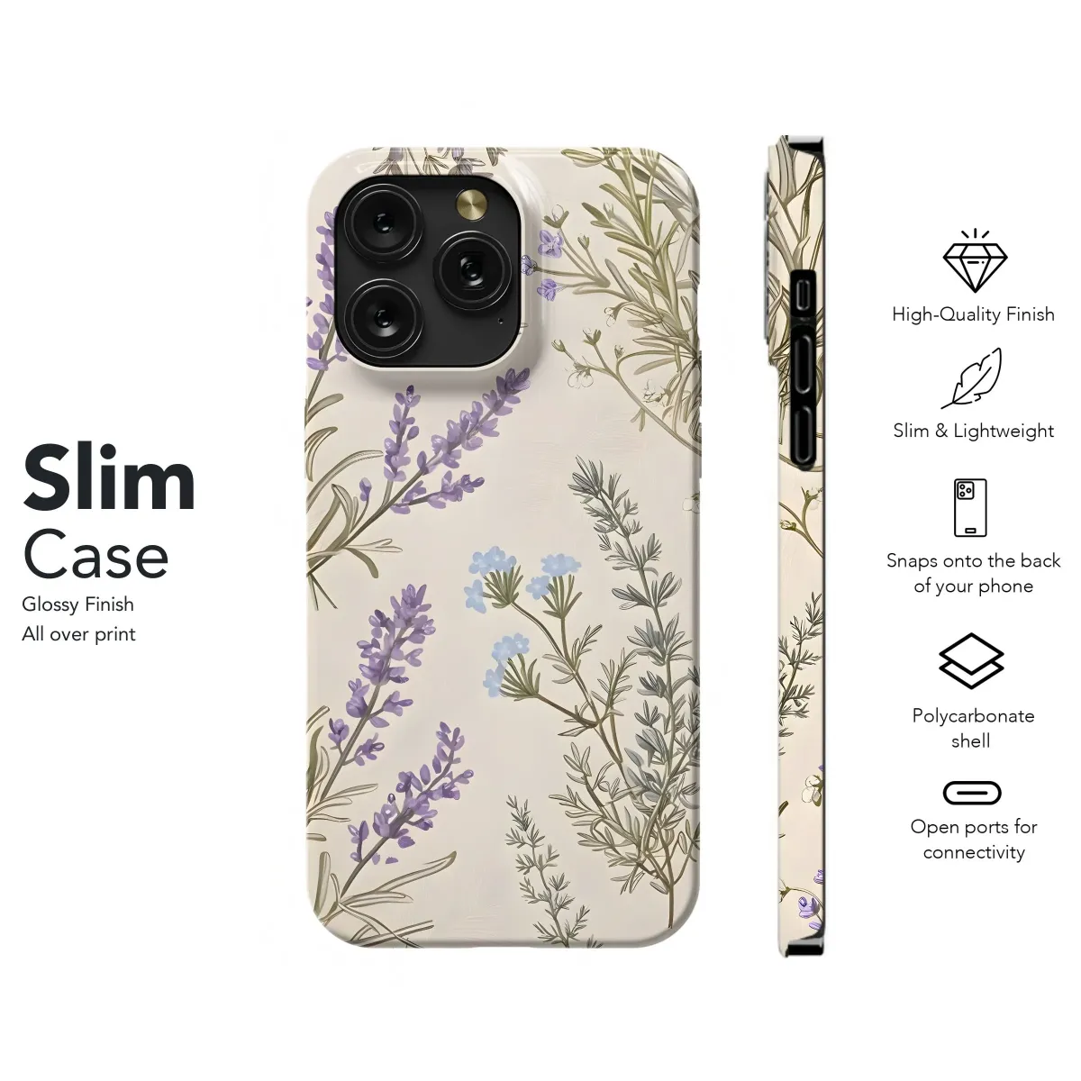 Vintage lavender blooms adorn this protective phone case. Available for iPhone, Samsung, and Pixel models. Style meets security!