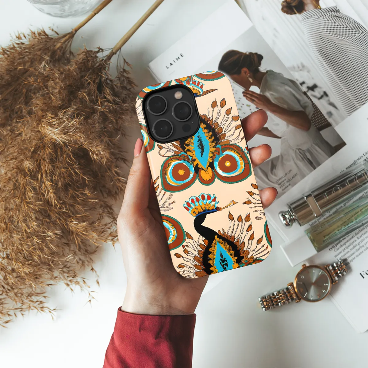 Adorn your smartphone with this captivating Warm Peacock Phone Case, designed for both iPhone and Samsung users. Its vibrant peacock feather pattern will elevate your style with its enchanting beauty. Crafted with precision, this case ensures a snug fit, safeguarding your device from scratches and impacts.