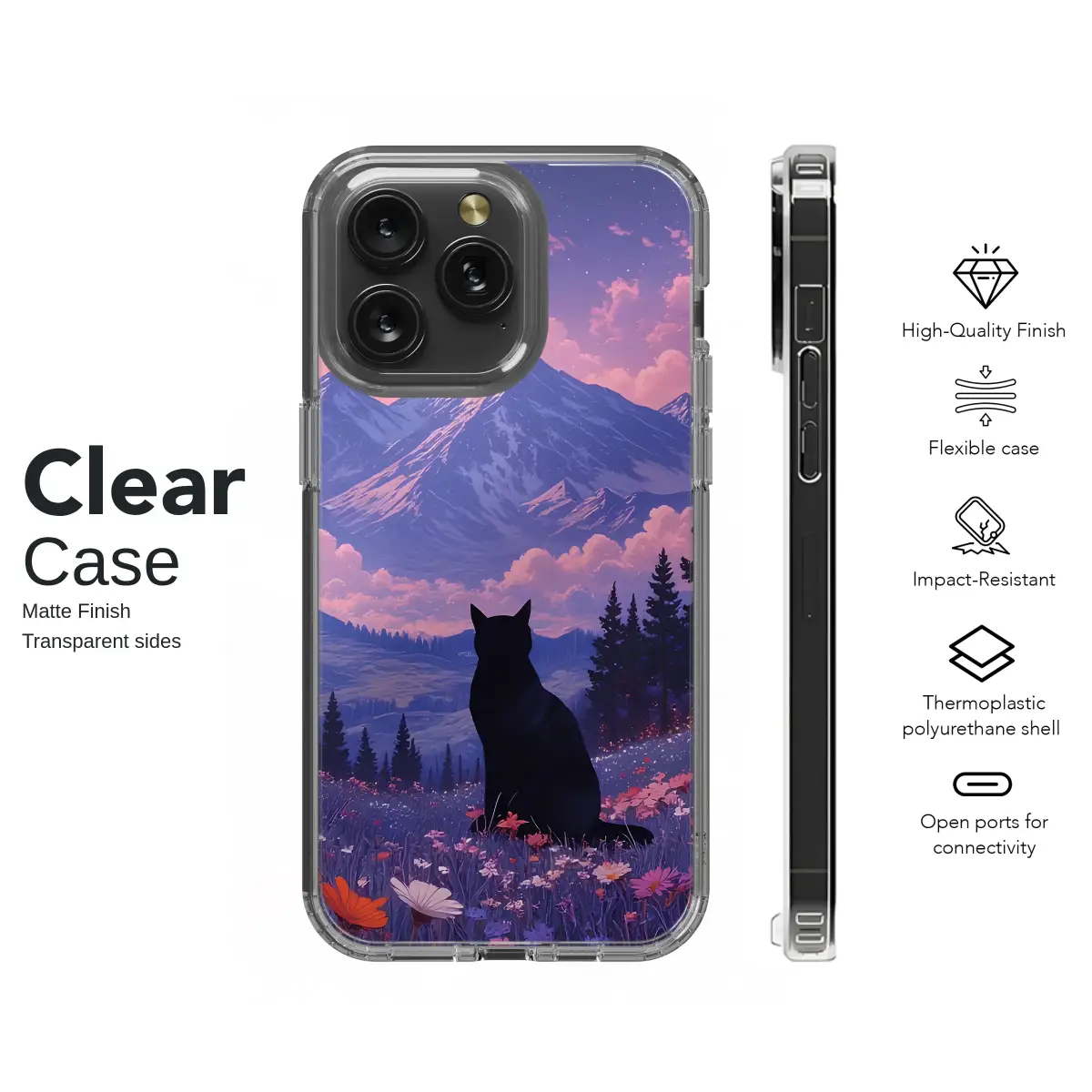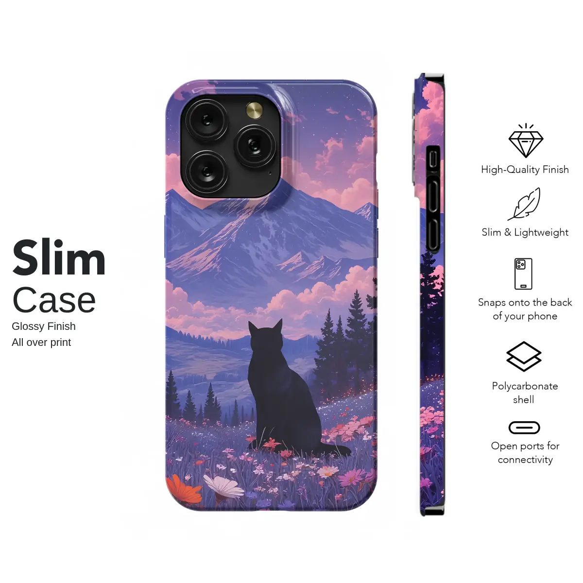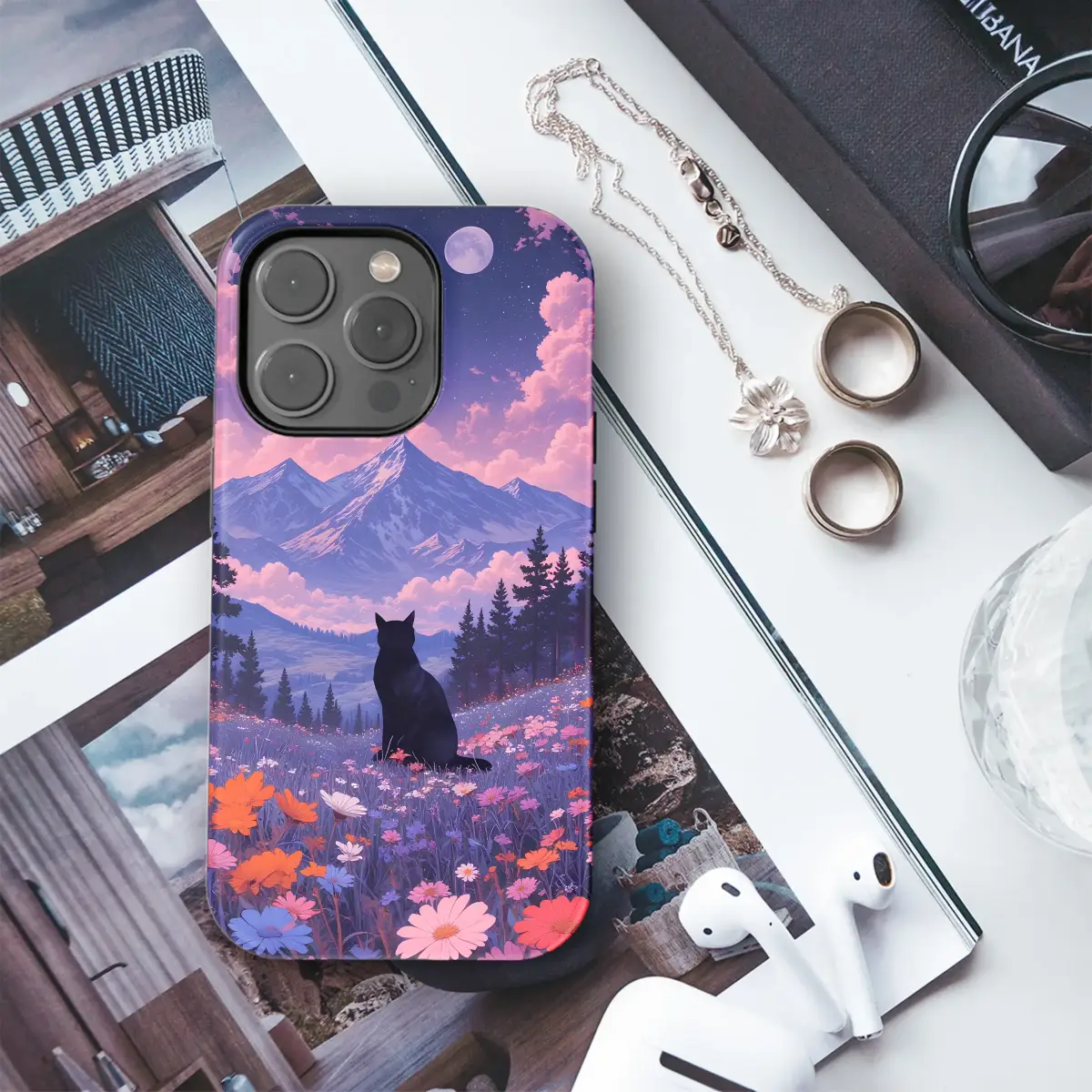 Escape into a world of quiet magic and wrap your most essential companion in a dreamscape of serene beauty. In this enchanting scene, a mysterious black cat sits as your silent guide in a meadow bursting with vibrant wildflowers, their jewel-toned petals a riot of color against the deepening twilight. Look up, and your gaze will be drawn past majestic, snow-capped mountains to a breathtaking sky painted in hues of lavender and cotton-candy pink. Luminous clouds drift across a star-dusted canopy where a full moon hangs like a celestial pearl, watching over the peaceful valley below. This design is a portal to a place where cottagecore charm meets whimsical, witchy wonder, a perfect aesthetic for the stargazer, the nature lover, and the wanderer at heart. Let this piece of wearable art transform your everyday tech into a talisman of adventure and tranquility, a constant reminder of the magical, starlit world that awaits just beyond the horizon. It's an ideal gift for a kindred spirit or a personal treasure that lets you carry a pocketful of starlight and mountain air on all your daily journeys.