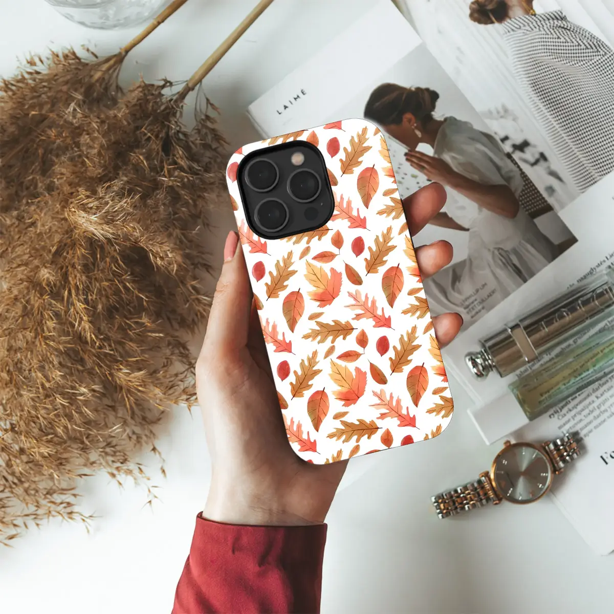 Embrace the cozy feeling of fall with this charming watercolor design. A beautiful pattern of autumn foliage, featuring a variety of leaves in warm shades of orange, red, and rustic brown, cascades across a clean white background. This botanical artwork captures the rustic essence of the season, making it a perfect accessory for any nature lover.