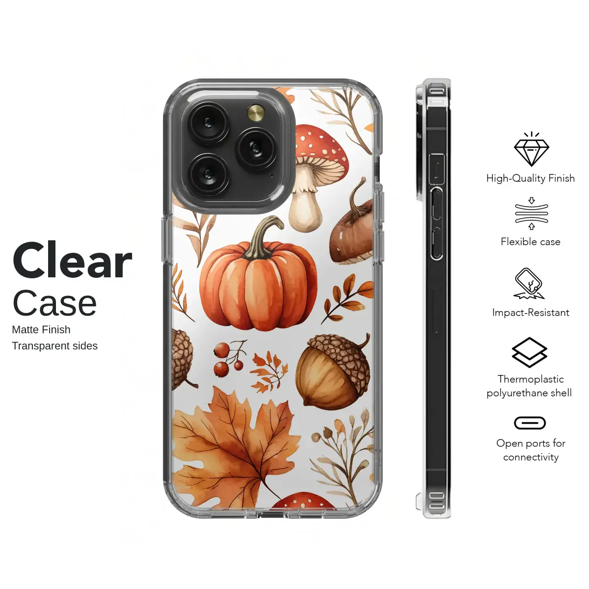 Embrace the cozy spirit of the season with this delightful autumn-themed design. This whimsical watercolor illustration features a vibrant pattern of plump orange pumpkins, rustic acorns, and colorful fall leaves in warm shades of red, orange, and yellow. Dotted amongst the foliage are charming toadstools and tiny red berries, creating a warm and inviting cottagecore aesthetic perfect for any fall lover.