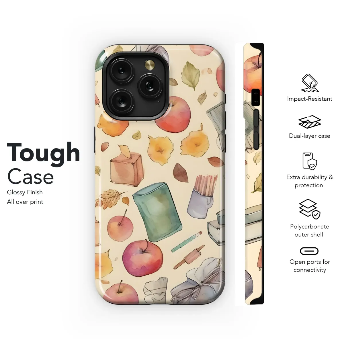 Embrace the cozy academic spirit with this delightful watercolor design, perfect for adding a touch of scholarly charm to your everyday tech. Featuring a whimsical pattern of autumnal apples, delicate fall leaves, vintage spectacles, and classic school supplies like books, erasers, pencils, and pencil holders, this design evokes a sense of nostalgia and intellectual curiosity. The soft, muted tones of ochre, russet, and sage create a warm and inviting aesthetic that complements any style. Ideal for students, teachers, librarians, or anyone who appreciates the beauty of learning, this charming artwork is a unique way to express your passion for knowledge and the cozy vibes of the back-to-school season. Give your device a touch of scholarly style. This design is great for Apple lovers, fall enthusiasts, or anyone who wants a unique, artsy look.